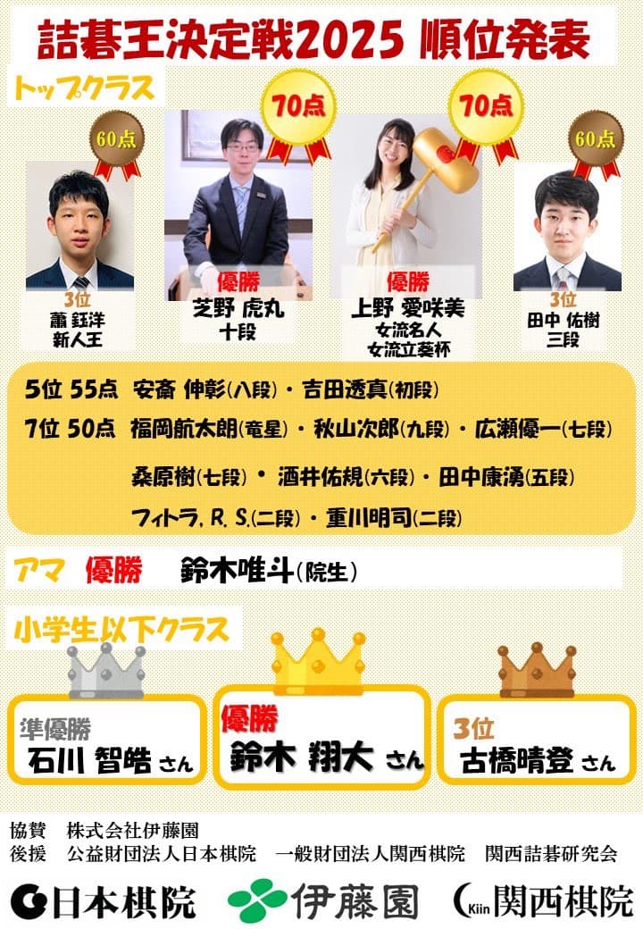 Last week on Dec 27, 2025, Nihonkiin held a new Tsumego Champion tournament in Tokyo and Osaka with a prize money of 300,000 yen. In the “Top class” group, there are professional and top amateurs participating (of a total 82 players). With 12 tough tsumego problems to solve under 2 hours (problems 1 to 4: 5 points each, problems 5 to 12: 10 points each. These problems are constructed by top Korean and Japanese players, like Shin Jinseo, Kim Jiseok, Kono Rin, and verified by Ichiriki Ryo). And the winners are Ueno Asami and Shibano Toramaru, both got 70 points.