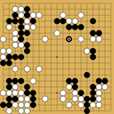 Somehow in this game I created a lot of weak groups and had 8 groups in total. So I wonder how I could’ve avoided splitting up so much. Also I’d like to hear some thoughts on how to choose josekis better.