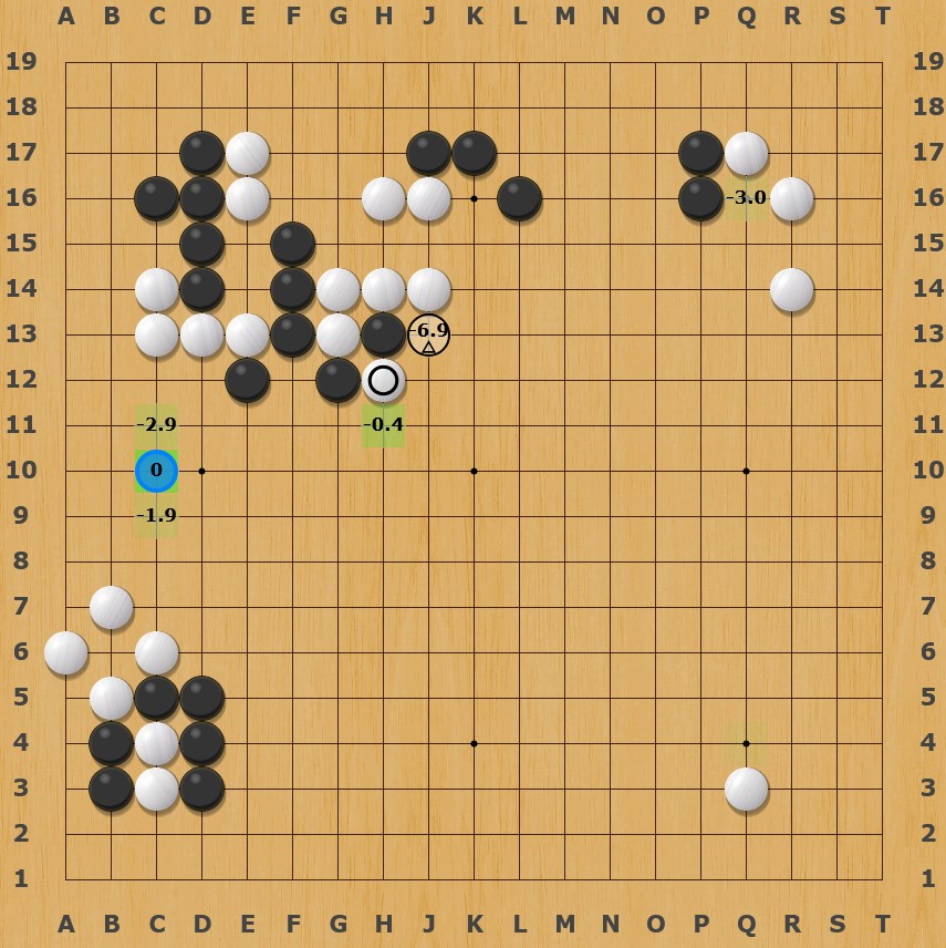 C10 is a big problem, even with the g13 cut working. All the Black groups are alive, both White’s groups lack eyes. It is very unlikely that both can be saved.