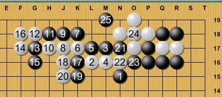 Then moves 24 to 40 (the G13 cut) are almost a constant alternation for White between the focus being towards one or the other group, while Black only has one group to tend for. That is a kind of fight that usually eventually leads to a bad result.