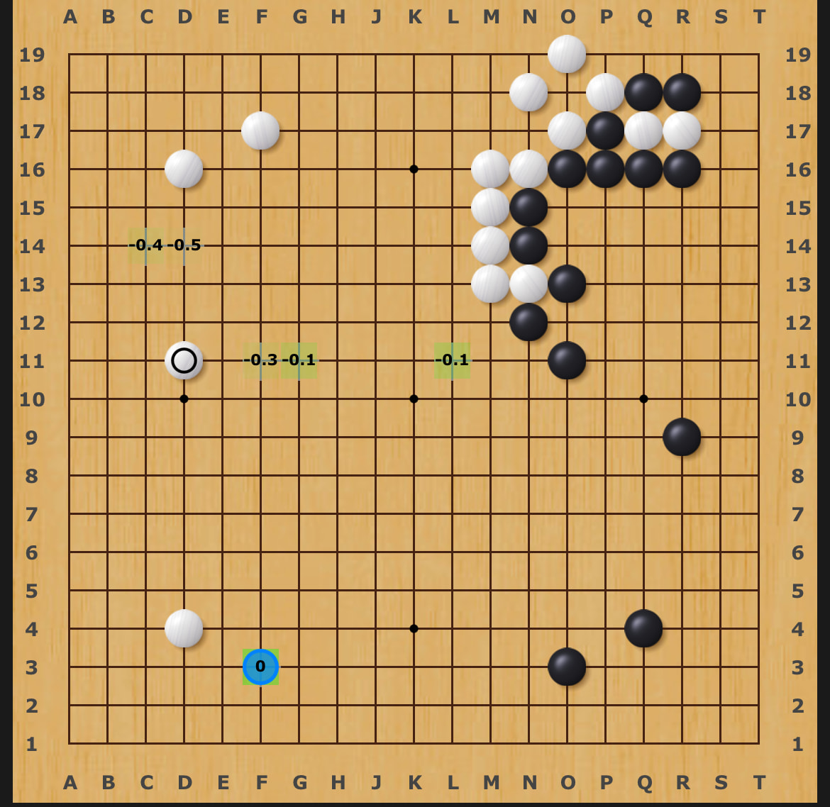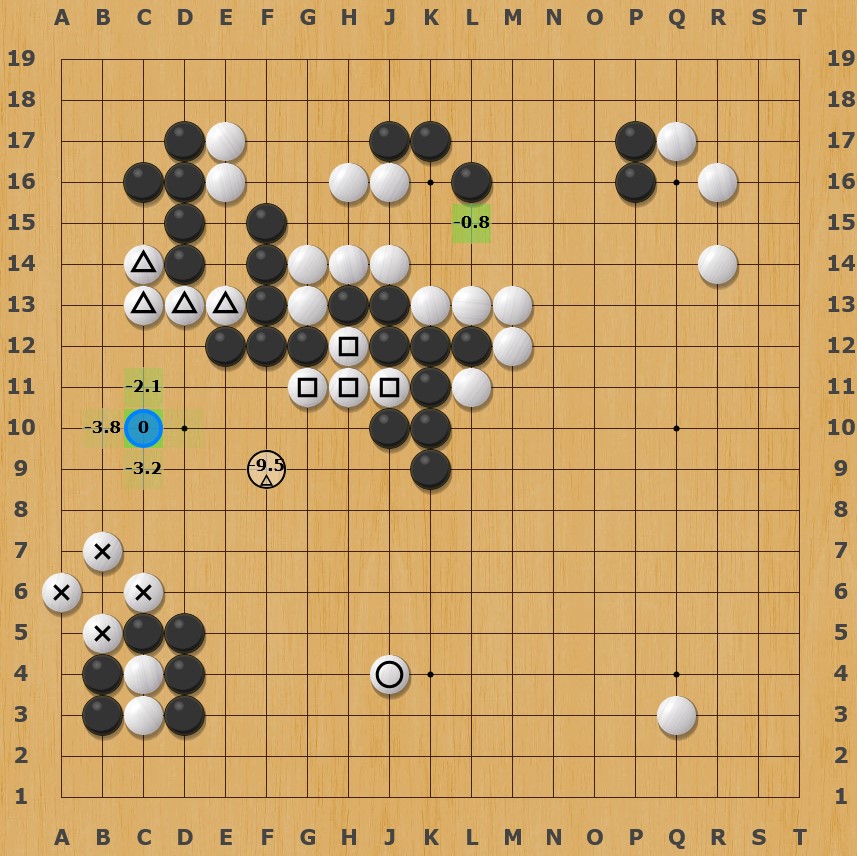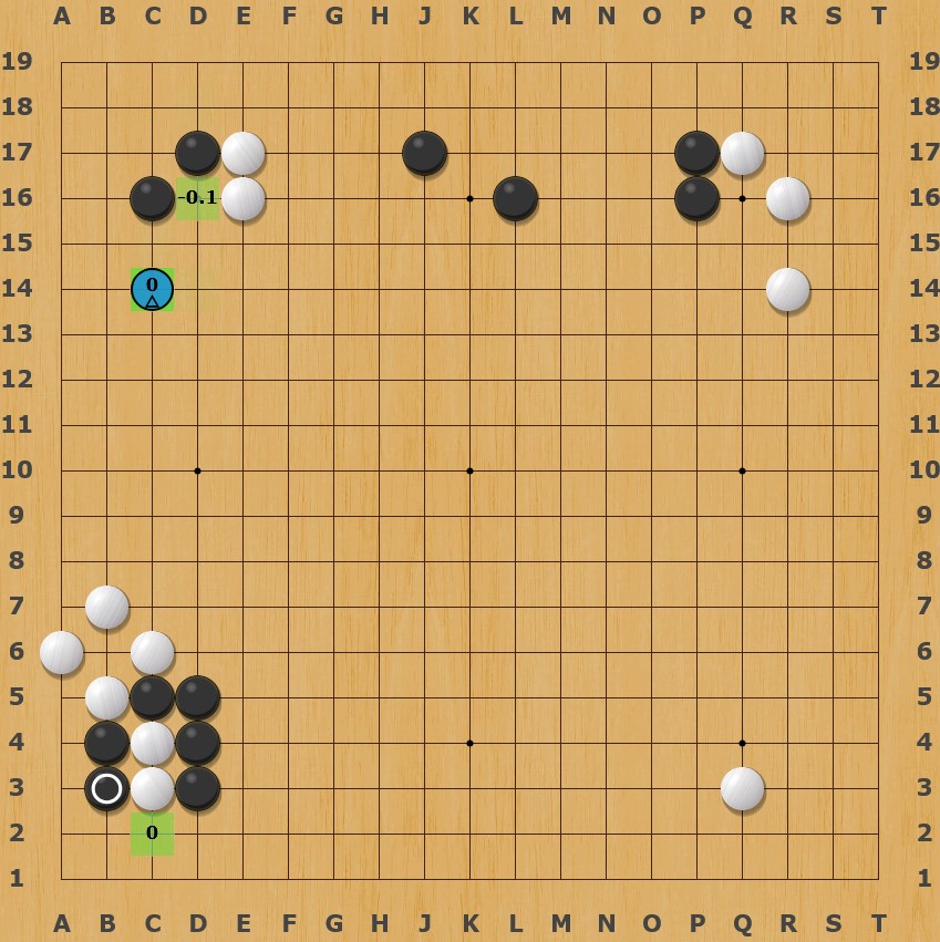Granted that the chosen move is actually the “AI suggested move” but if you click on it, the AI plans to use c14 as a stepping stone to extend towards the four stones at the bottom left, which is something that didn’t happen in the exchange.