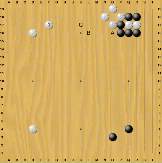 The normal joseki moves for White there are A, B or C, however the choice of 1 is also very viable now because it practically wants to lure Black by presenting a tough choice: