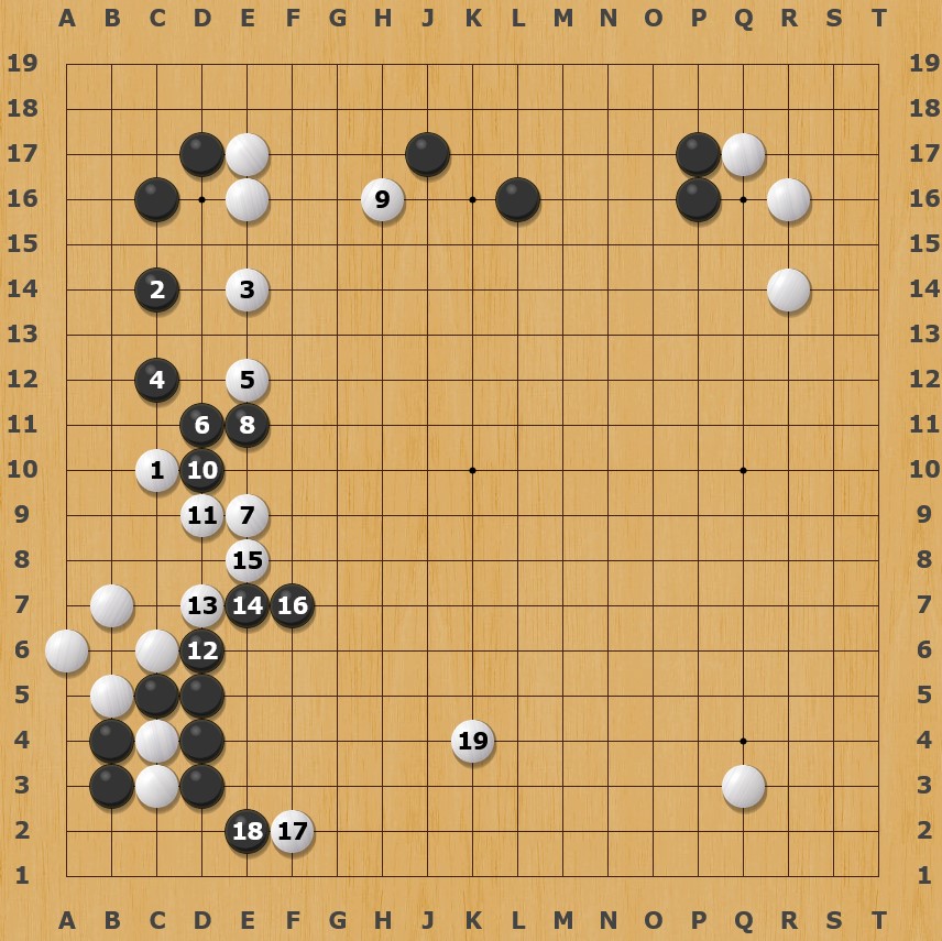 All this, of course, stems now from the incorrect joseki choice (see P.S.) and in this case White didn’t really tenuki from the joseki and abandoned the stones to pursue a different object (like it happened in the reviewed game and avoiding this is a sensible advice), but went beyond the joseki to apply a more creative strengthening of those stones.