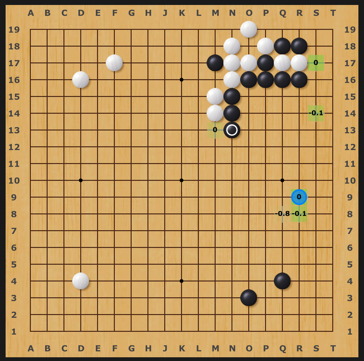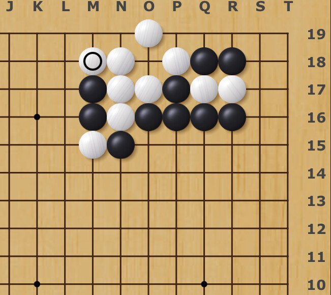 Back in the current joseki, Josekipedia confirms that “White can tenuki” and Black’s best follow up is N15 and White plays L16: