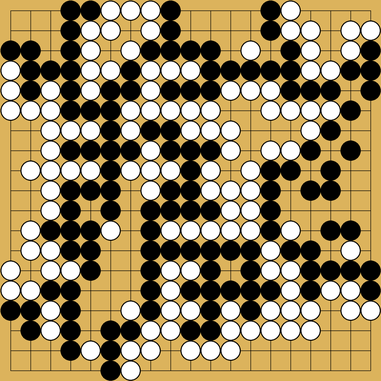Definitely not as good as the “AI suggestion”, but at least it is something that is easy to understand and deal with. Black’s groups are still safe, White’s groups are still in some danger, but even if attacked, they will both survive or even connect with one another, since there is some synergy being attempted.