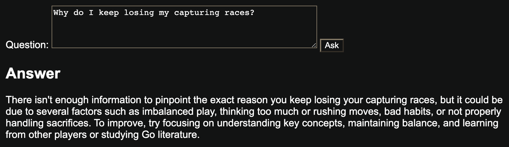 What I’m unclear about is what it has to do with what I suggested. In case it wasn’t clear, I did not mean to suggest that you could use this tool to aid you in ongoing games. I intended to suggest that you can give it “reasoning” abilities by hooking it up to a go engine that would allow you to ask those kinds of questions (and hopefully you don’t ask it those kinds of questions during an ongoing game).