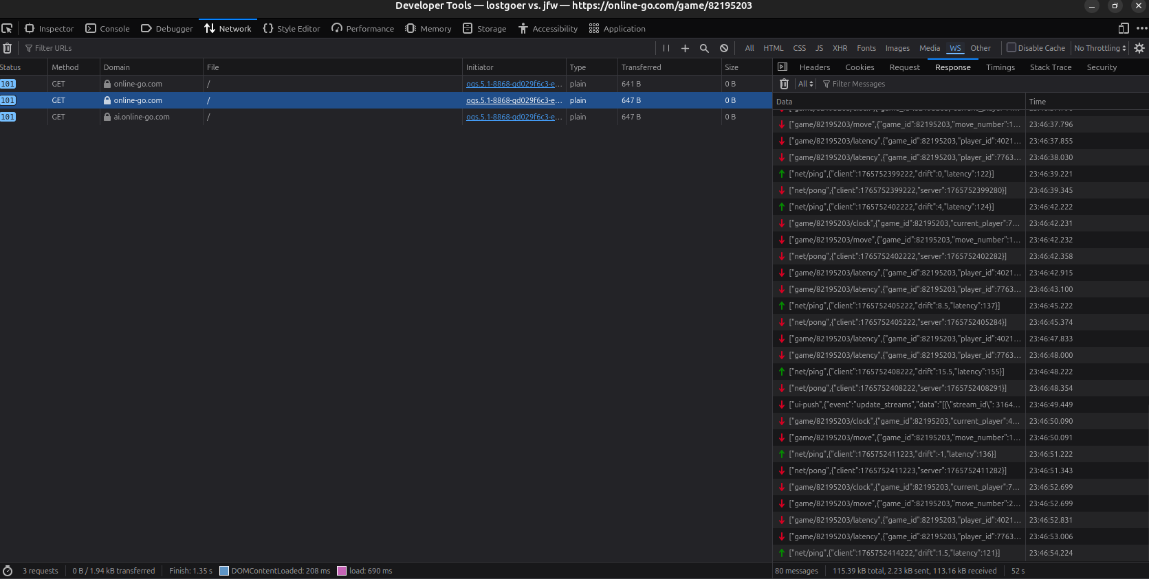 In Firefox I open a game, then open the dev tools network tab and select WS, then I reload the tab showing the game. Then I click through the GET requests in the list and look at their response tab. There are all the messages: