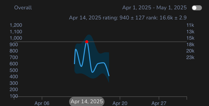 Let’s say it’s only throwing like 3/50 games completely at random, so p=0.06 that it loses to anyone, it will still lose a lot of rating to 25kyus, could be like 50-60 rating points a game. It gains like 6 rating points if it wins. I think maybe that’s a very slight rating gain on average