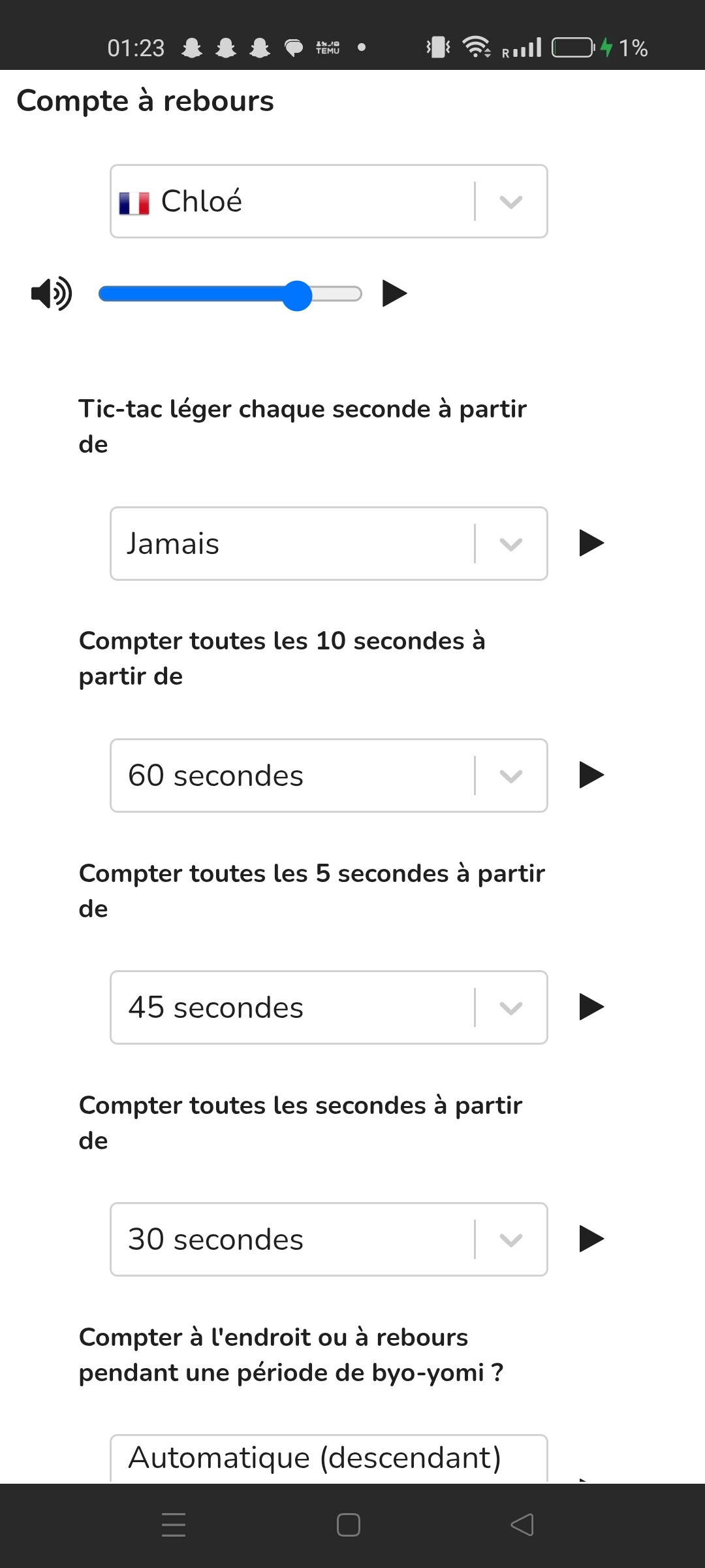 In my experience, thé clock countdown settings function for thé last seconds remaining in thé Fischer clock (counting down from 60 seconds with my settings), but I’ve only been hearing ‘‘4 periods left’’ “3 periods left” etc. in thé past hours in byo-yomi games, and nothing in Fischer games in thé last 60 seconds.