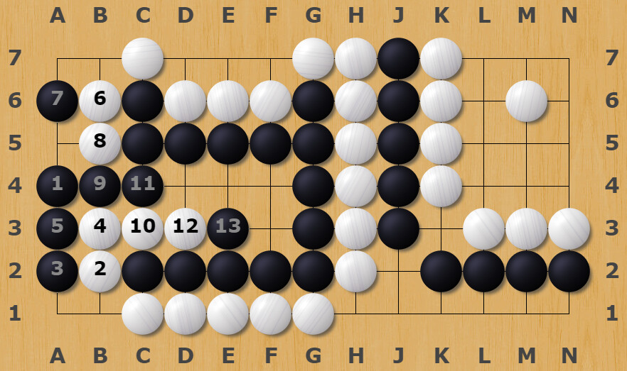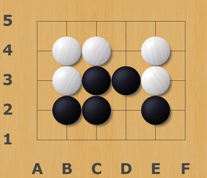Black needs to make seki between B4 and B2 to survive. To achieve this, preserving liberties is very important. Something straightforward like this obviously doesn’t work: