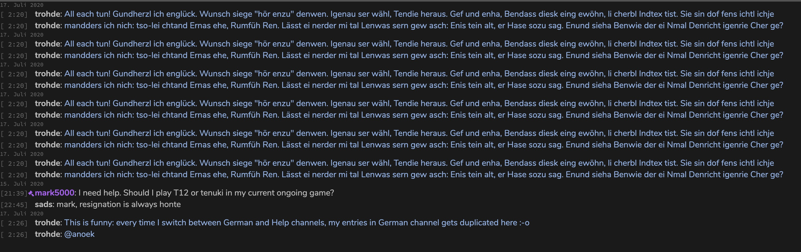 Every time I switch between German and Help channels, my entries in German channel gets duplicated in the Help channel :-o And it’s getting more every time I switch back and forth again.