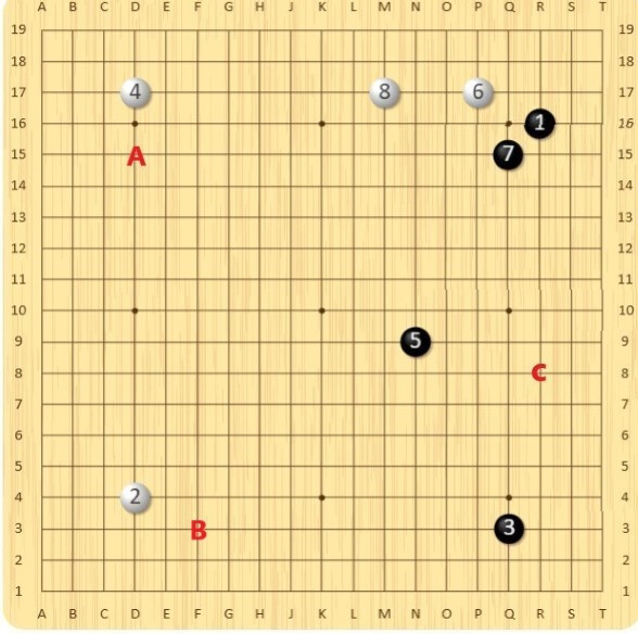 And the key is to use the Shite keystone in the air as an anchor and gain outside high positions if possible. And the distance to the side is quite important for assisting the attack white would want to play on the lower right than really building a center moyo. Measure the distance with 2 space jump, or large knight’s move, and see if they help defend any weakness from the outside.