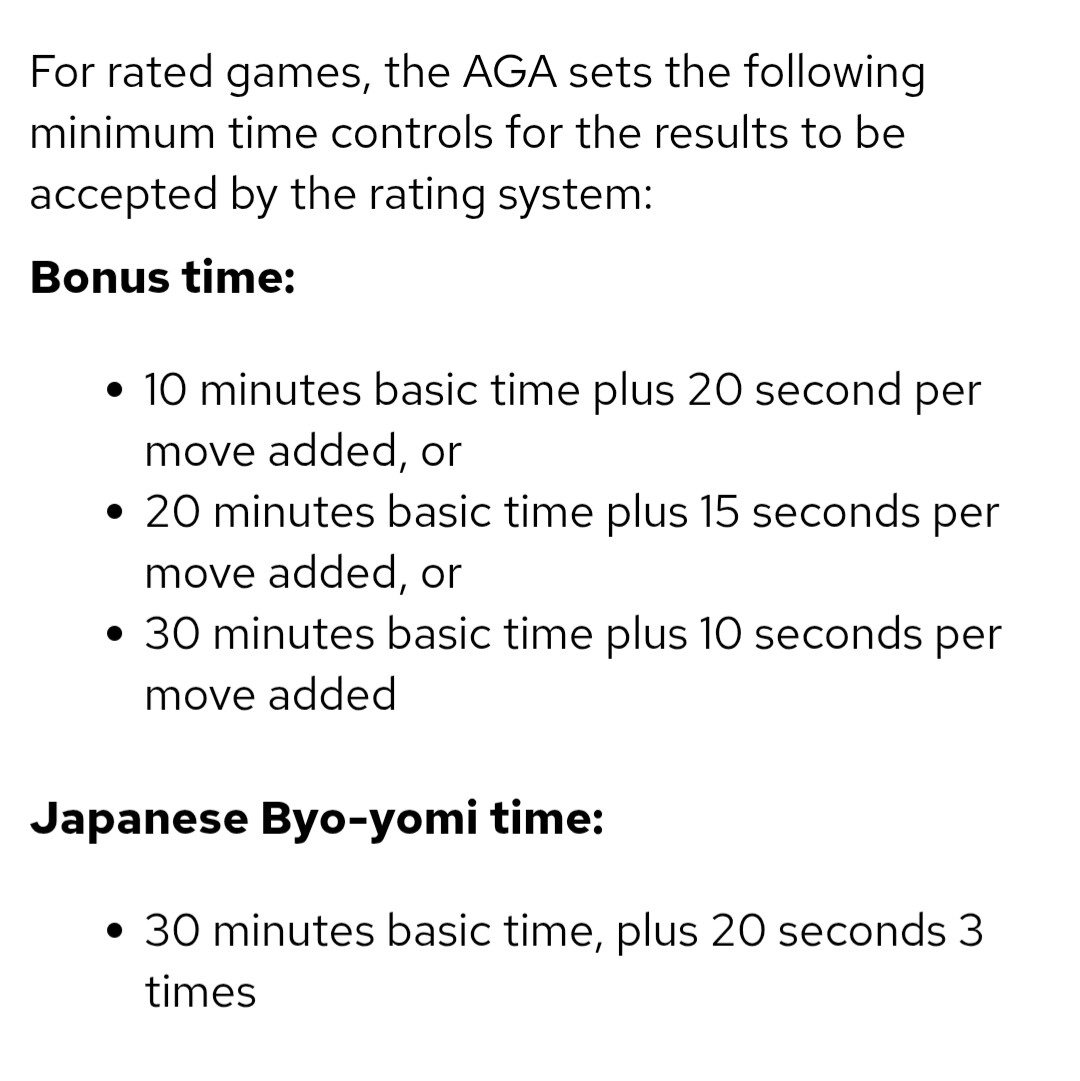 I do think there is some folly in being pegged to the AGA + EGF 1D range. The AGA has minimum time settings that let a game qualify as a ranked game. What are they? A lot longer than OGS! AGA 10 minutes + 20 seconds vs OGS 5 minutes + 7 seconds.