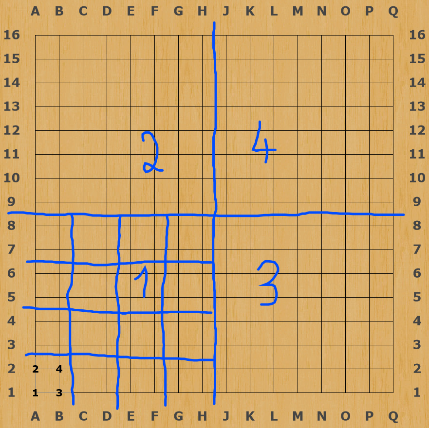 Like Quartered Go, it is also played on an even-sided board (e.g., 12x12, 16x16, or even rectangles like 14x18), which allows for the board to be cleanly divided into four equal quadrants. The top-left quadrant is called the “odd-odd” quadrant, the top-right is called “even-odd”, the bottom-right is called “even-even”, and the bottom-left is called “odd-even”. Each move chooses which quadrant the next move must be played in, based on whether the coordinates of the move are even or odd.