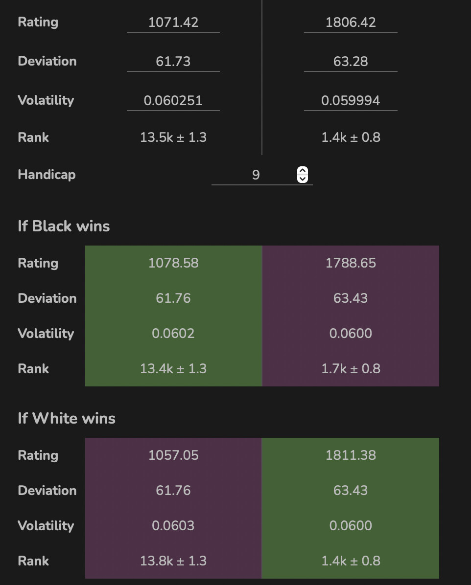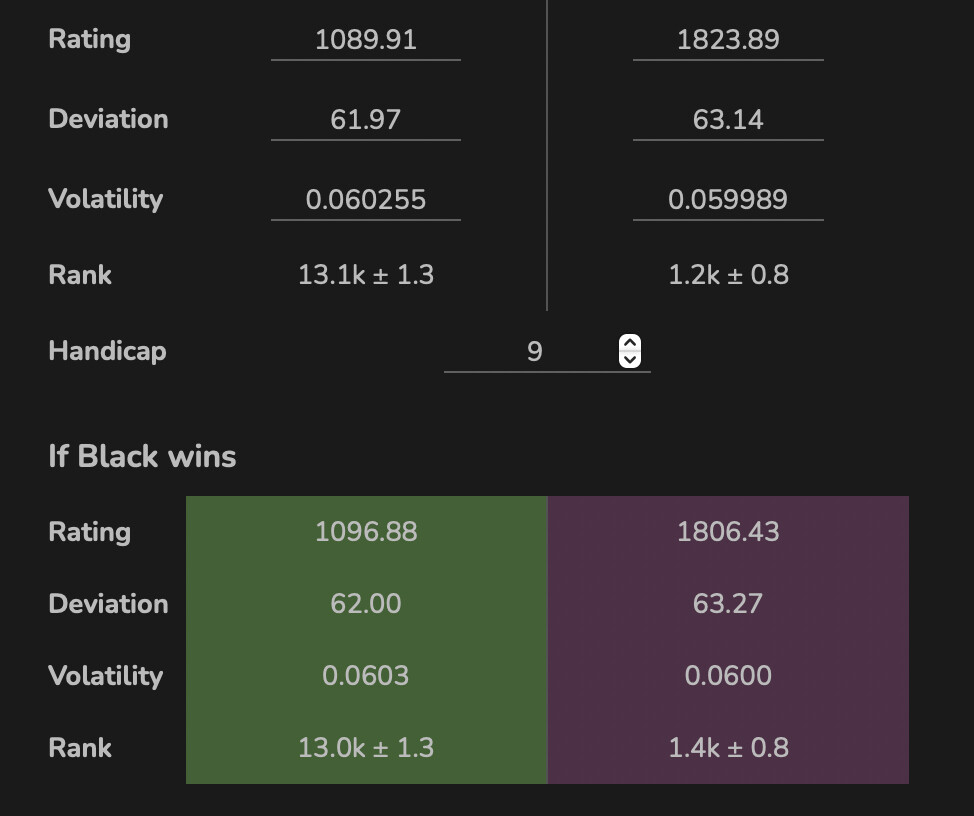 It looked like it worked ok for the non-handicap games. Occasionally it’s off by 1 decimal place, like 1e-2, but I’m not sure if that’s rounding or something else. I tried looking up the oppoents volatility also in the following examples.