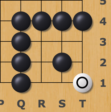 ^Let’s imagine a corner looks like this. Obviously, white can’t make two eyes in this space, so black has no need to play S1 and T2 to remove it from the board. It’s already “dead.”