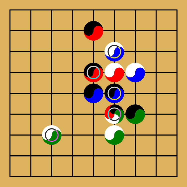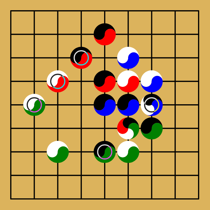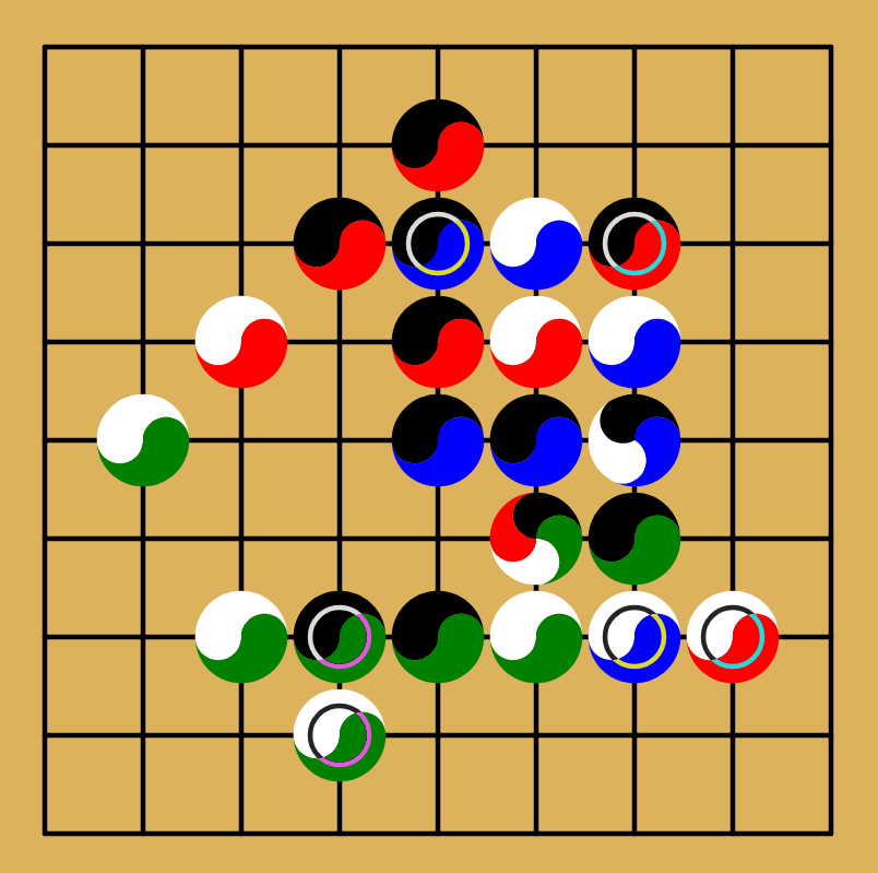Well me either, but it seems like red is dominating the top, and green might soon control the bottom. Black has taken the center while white is strong on the edges. Blue is in a difficult position.