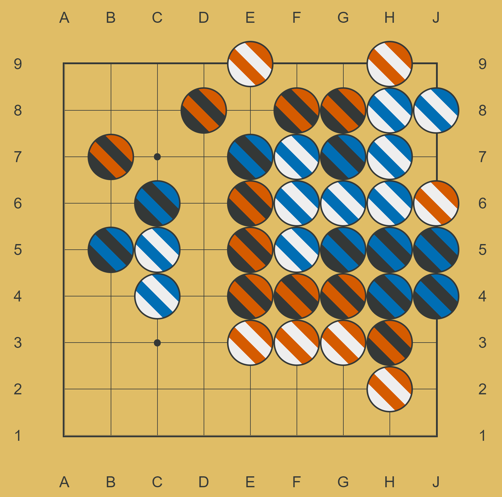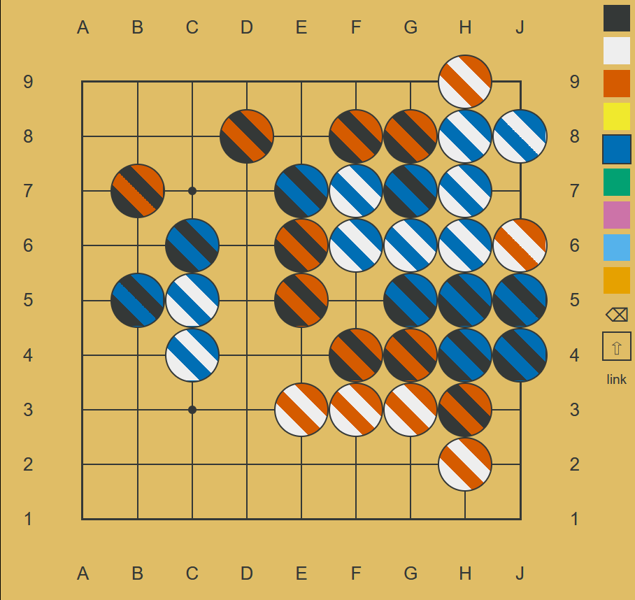 @Here_We_Go it seems like Vsotvep and yebellz are trying to capture the G7 and G8 chains. If you play E8 here, then the red chain can’t connect to the outside. I’m eyeballing (Black | Blue) D9 in an attempt to buy enough time to fix the defects in the red connection.