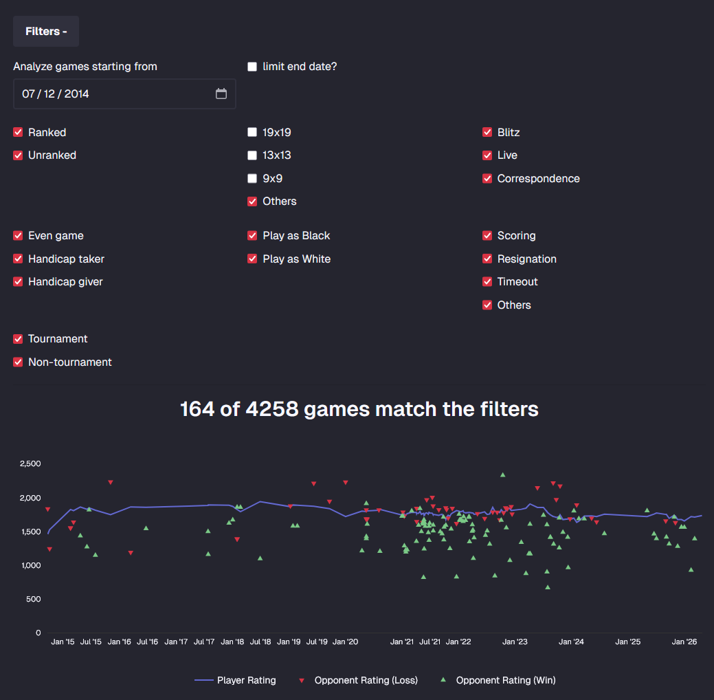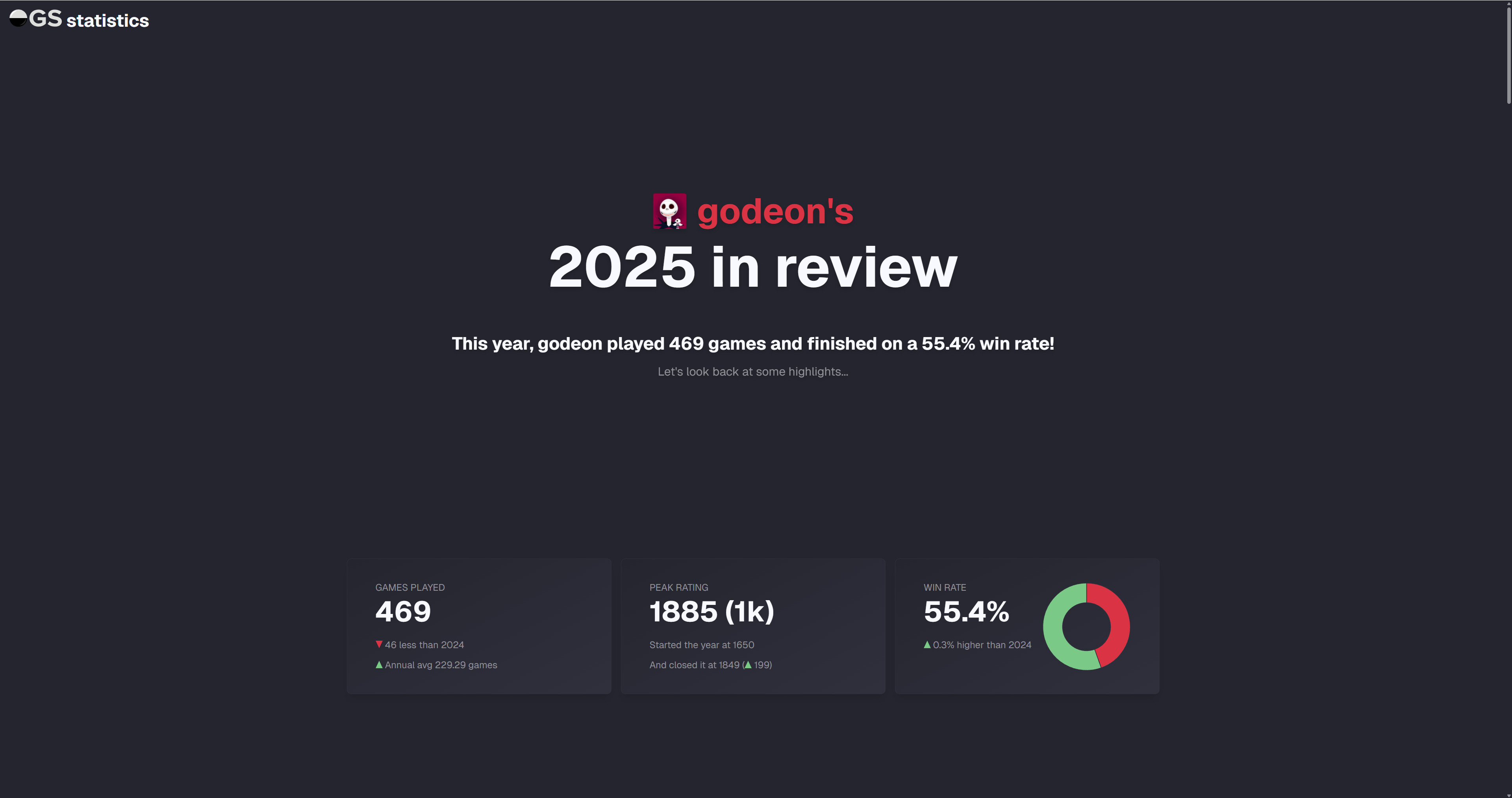 Oh and, it comes with a SHARE button that give you an instant access link, with all info embedded into the link itself. So your friends can see your Year in Review immediately without waiting for the queries from OGS! Check out this link to view @godeon ‘s YIR page with instant access.