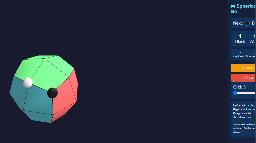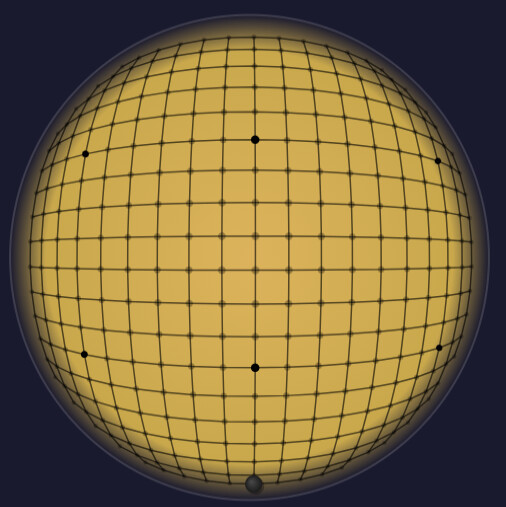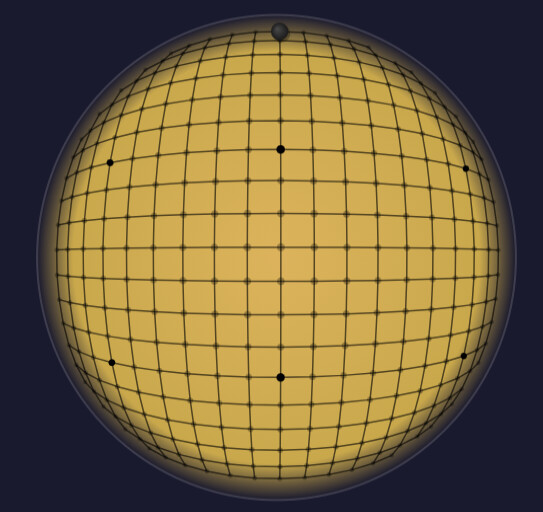 Interesting side effect of the cube-to-sphere mapping - most of the intersections on the sphere have 4 liberties, except for the 6 corner spots, which all have 3 liberties
