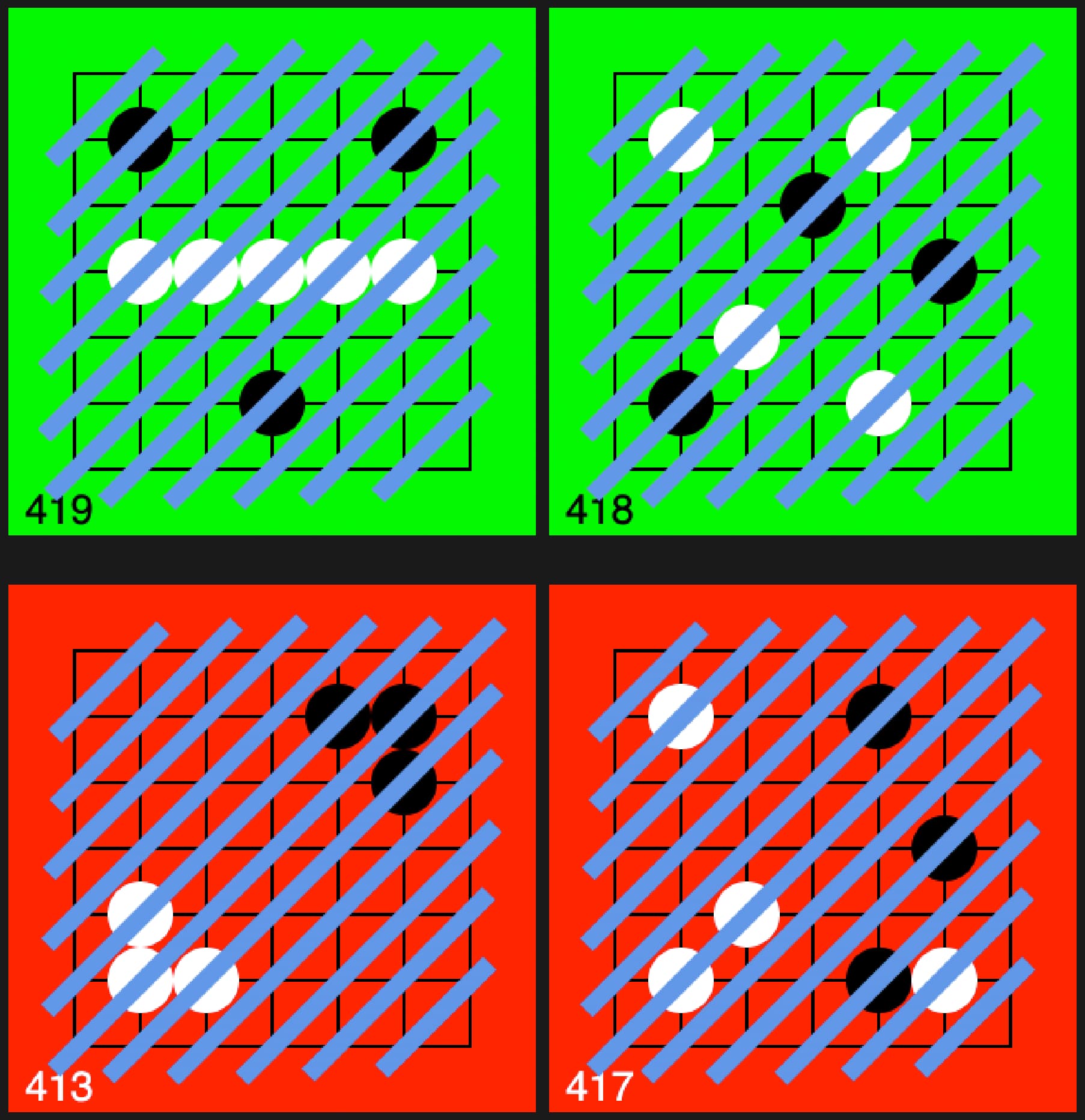 I conjecture that green koans are those such that all stones of each colour lie on different diagonals (i.e. no two stones of the same colour lie on the same diagonal):