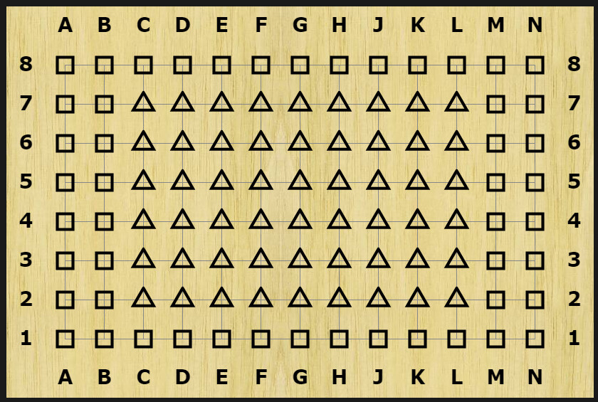If I were to generalize ācenterā and ārimā for rectangular boards, I might define the ācenterā as that central rectangle of the board whose number of intersections is closest to the number of intersections of the remaining board (ārimā). On a 7 x 7 board, that center would be 5 x 5 (25 intersections to the rimās 24 intersections). On a 13 x 8 board, I think the center according to this definition would be 9 x 6 (54 intersections to the rimās 50):