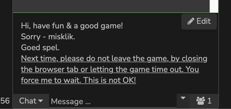 When an opponent has timed out (maybe after thinking long in an already lost position or otherwise), I will send this message. I don’t suppose it will help much, but giving a signal that timing out is not okay, gives me at least a positive feeling.