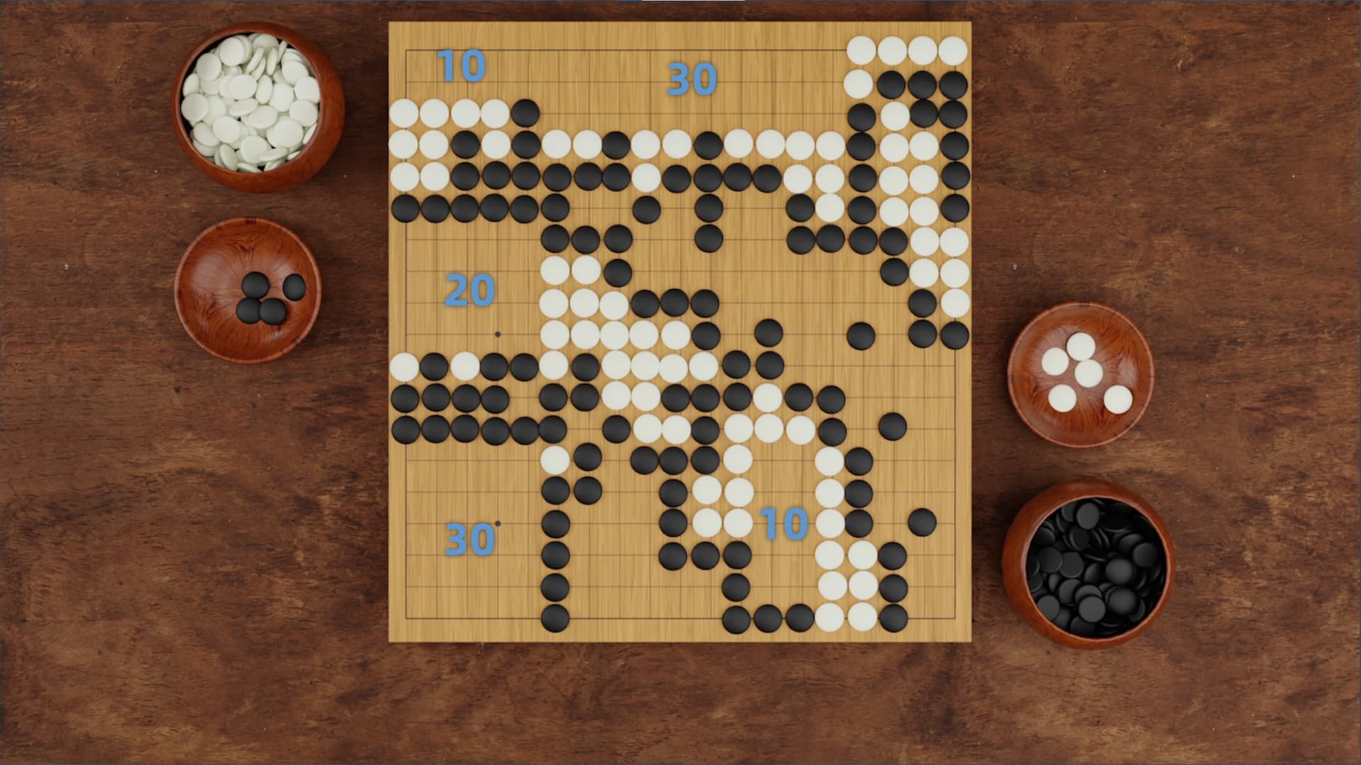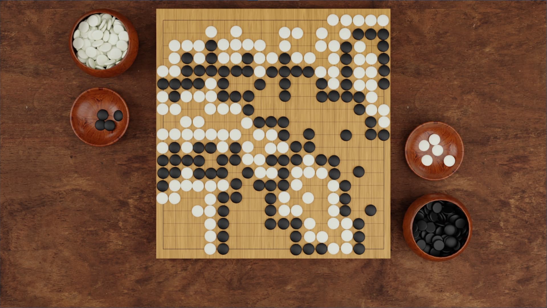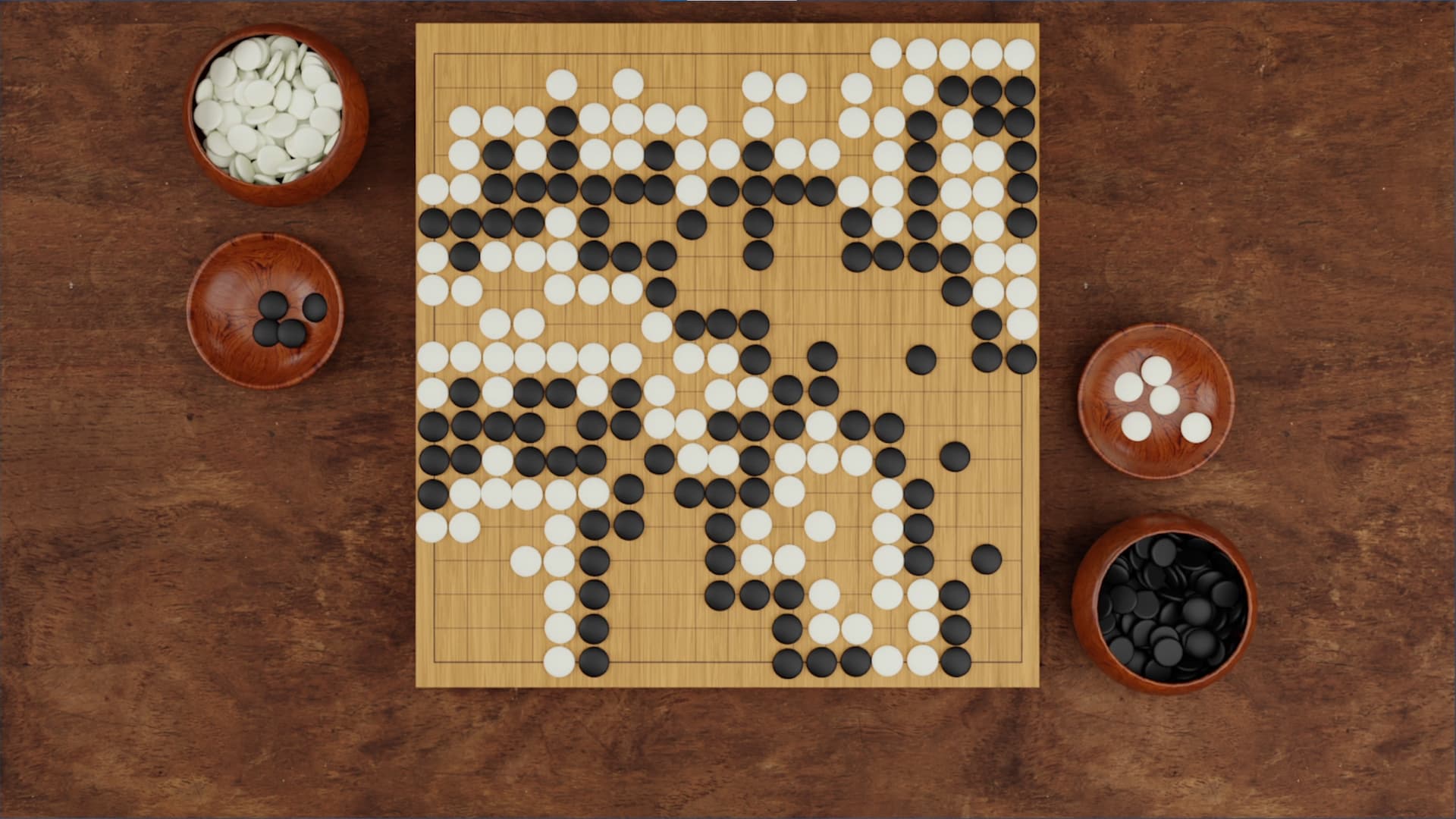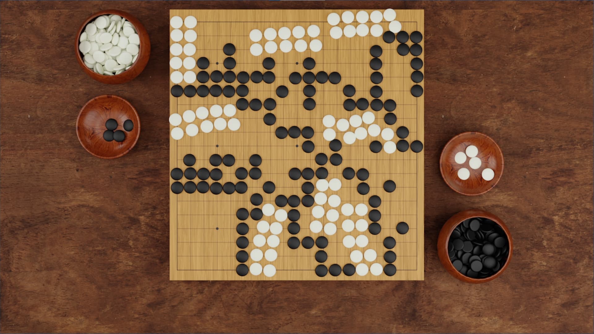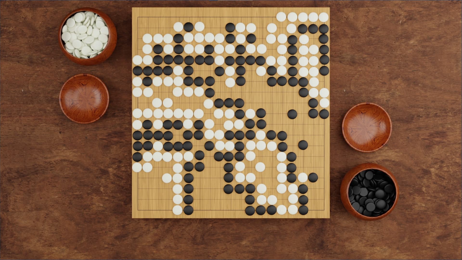 Finally, we know that there are 361 intersections on the weiqi board, half of which is 180 and one-half points. Since Black plays first and has an advantage, we artificially apply a correction—Black must pay komi of 3 and 3/4 stones to White. Thus, Black needs 185 stones to win, and White needs 177 stones win, so in this game, White wins by 1 and 1/4 stones.