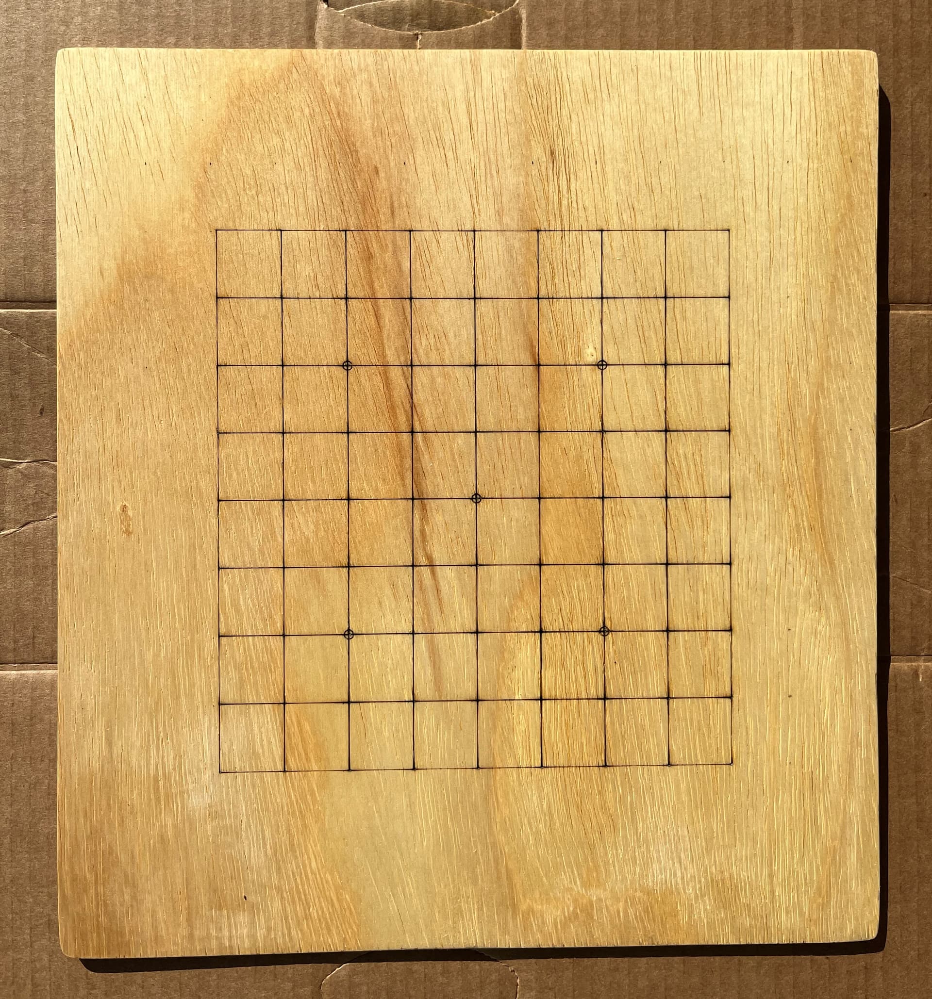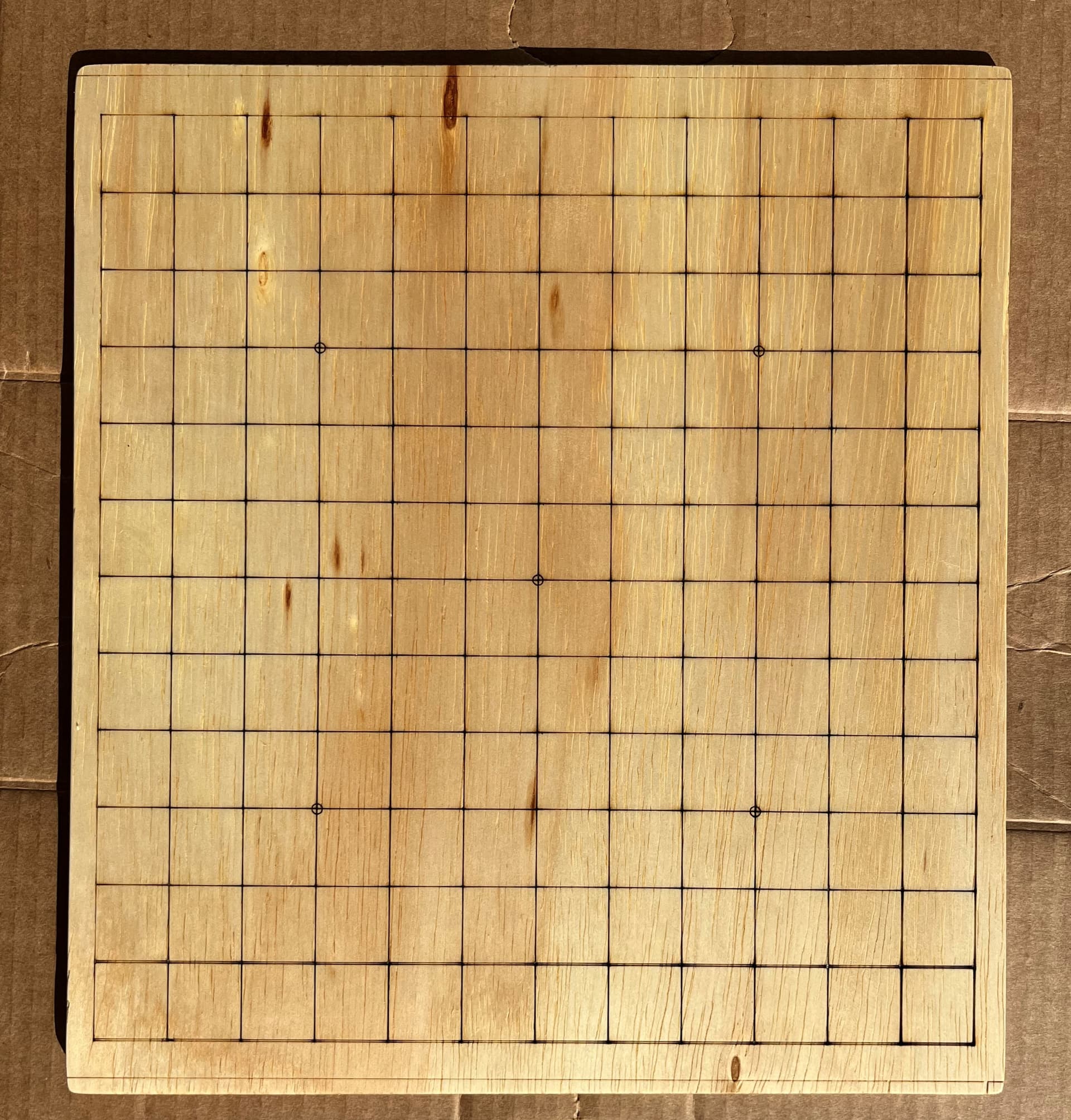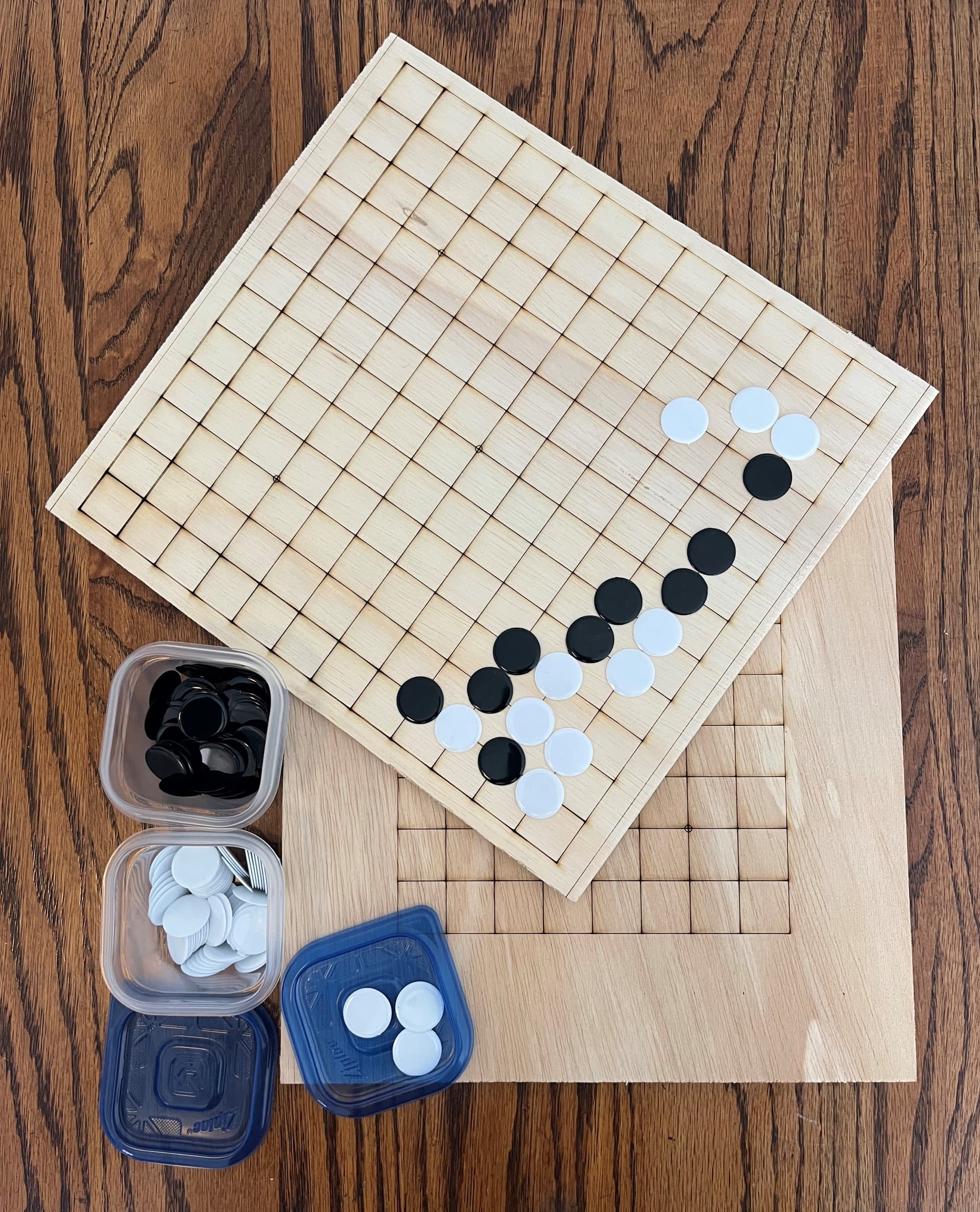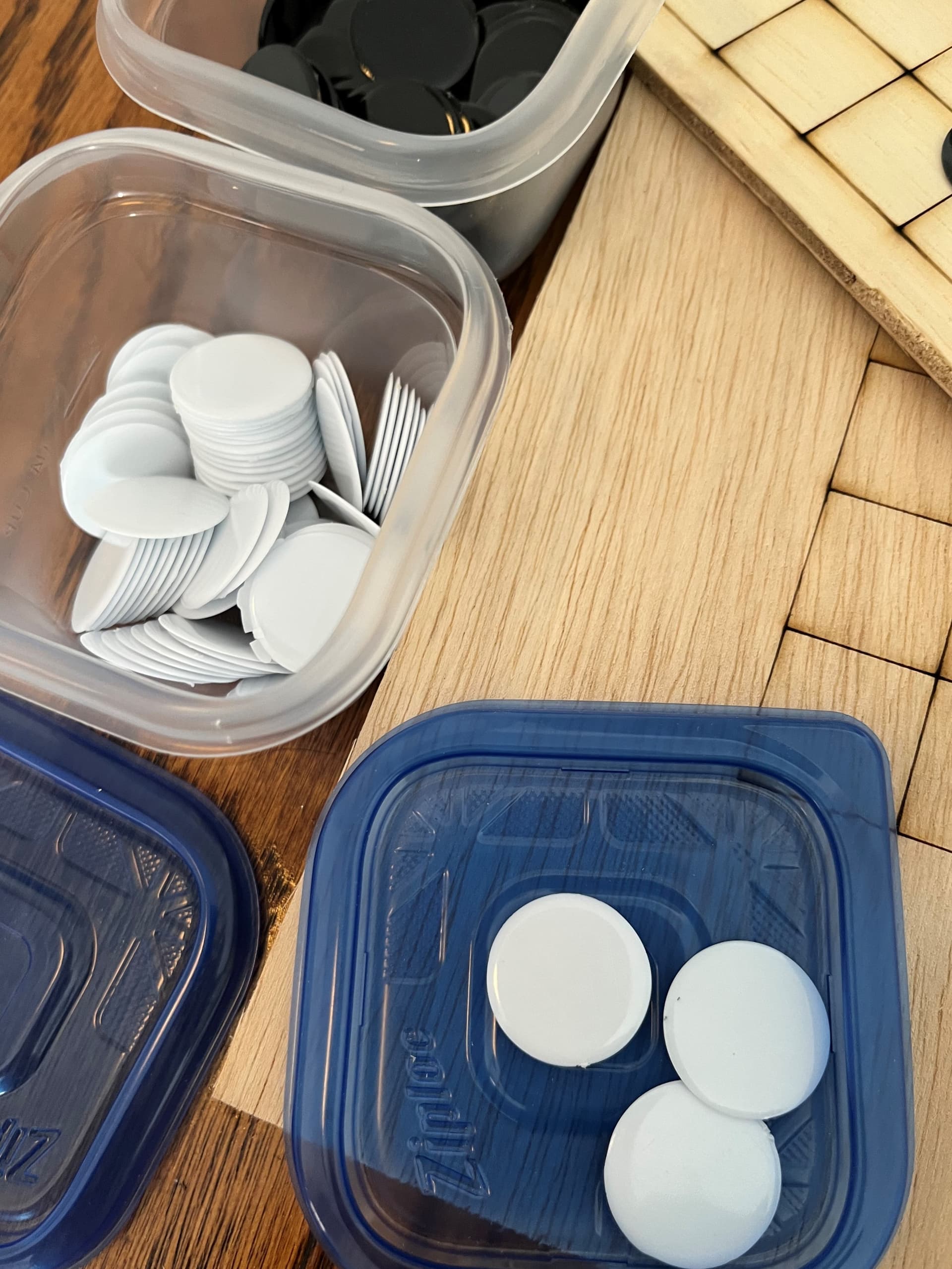 So, this is a subject that I have been thinking about for a long time. Before Covid, when I first started thinking about teaching Go to some of my friends and family, as well as through the AGF programs I learned about, and reading Go As Communication, I started wondering what would be the least expensive way to make a set that was also useful enough to keep someone playing until they got a full sized set of their own. Ideally, I imagined a set that would be cheap enough to send one to anyone who wanted one, kind of an idea. I am a wood sculptor who has professional woodworking experience and I also belong to a hackerspace with a laser cutter/engraver. This is what I came up with. One 4’x8’ sheet of 5mm plywood made 28 13x13/9x9 reversible boards. Some slightly warped or slightly different sizes, but all at least the standard minimum. The sheet cost about $20 at the time. I got two small bags of 7/8" Bingo Chips. They are a perfect normal sized stone, though there are some irregular ones as you can see. I probably paid another 20-30 for them, including shipping. The ‘bowls’ might have been the most expensive part, in my opinion for what you get, something like $3 for six with lids at the grocery store, if I remember correctly. Almost 11 complete sets for 13x13, or double that for 9x9, combining white and black in one bowl.