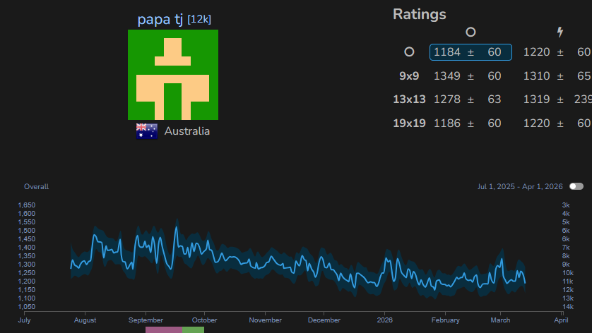 I appreciate that people clever-er than me put in much effort to make OGS what it is, including the rating system - which Iām certain is very technical behind the scenes. I also suspect that many people have a tendency to blame the rating system for their inability to progress. Iām not doing that - my problem is lapses of focus at critical moves.