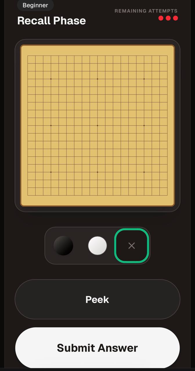 Reconstruct: Re-place the stones on a blank board from memory. (use peek to see the positions again in 10s)