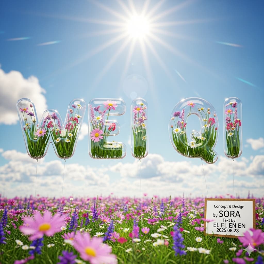 A hyper-realistic 3D rendering of transparent inflatable balloon letters spelling the word ‘WEI QI’, filled with colorful flowers inside (pink daisies, chamomile, wildflowers) and green stems, floating in a bright sunny sky. The balloons are glossy and reflective, with realistic highlights and shadows, creating a shiny plastic effect. The scene shows a wide field of blooming wildflowers (pink and purple tones) under a blue sky with fluffy white clouds. The sun is shining brightly at the top center, with sun rays and light flares, creating a vibrant and cheerful summer atmosphere. Depth of field effect with foreground flowers slightly blurred, photorealistic, ultra-detailed, cinematic lighting. Sign at right bottom corner calligraphy style Concept & Design by SORA, Text by EL EL EN EN 2025.08.28