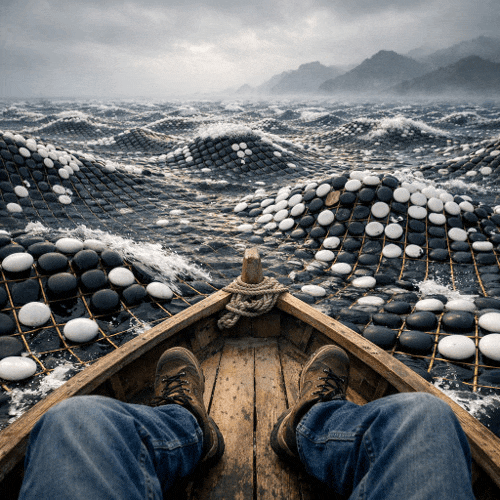 First person view photo of sitting in the boat in the middle of mysterious ocean of Weiqi Go baduk, water waves are moving.