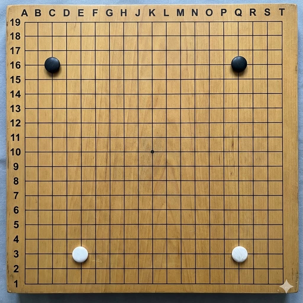 A 19x19 square weiqi board with each grid a square. Marking of numbers on the left side of the board for each horizontal line from bottom to top, and markings of the alphabet on the top side for each vertical line from left to right. A black stone is placed on the intersection of coordinate Q16, a white stone is placed on the intersection of coordinate D3, a black stone is placed on the intersection of coordinate C16, and a white stone is placed on the intersection of coordinate R4