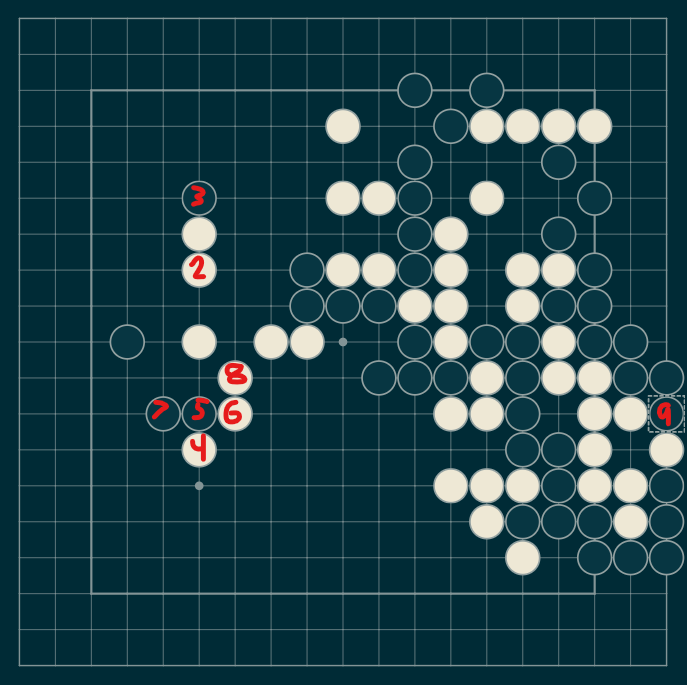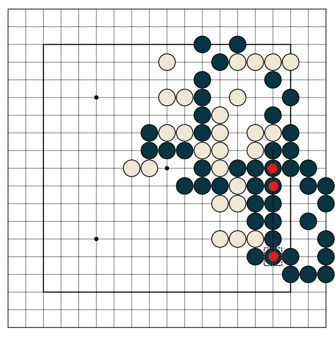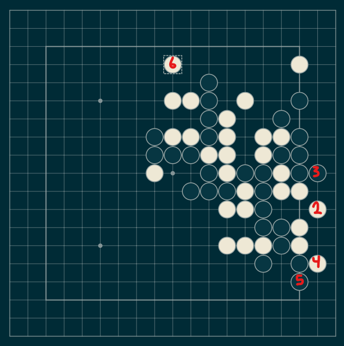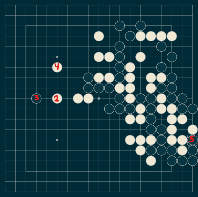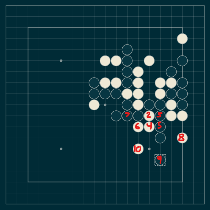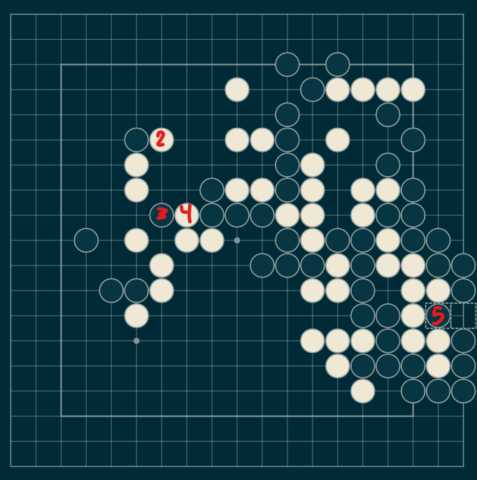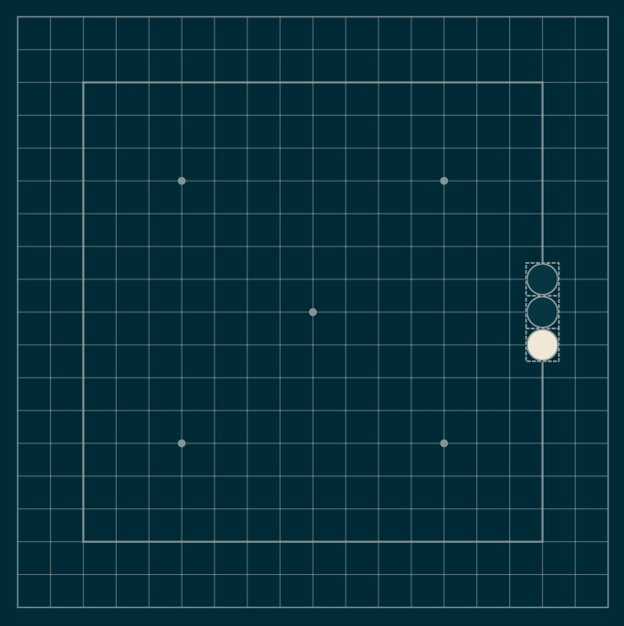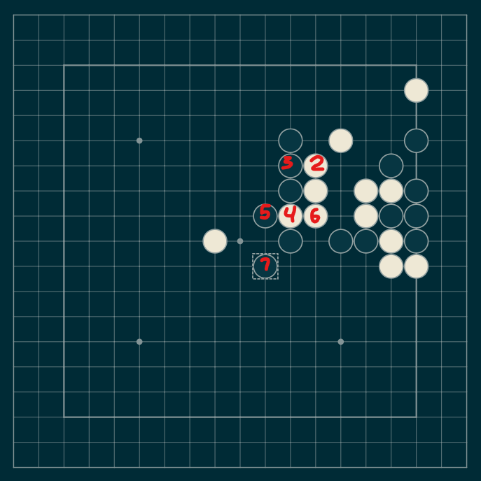 Irensei is played on a 19x19 Go board, with Go stones, and Go capturing rules, and Go ko rules, but with one significant difference: the goal is not to surround territory, it is to get 7-in-a-row in the center 15x15 area (in other words, stones on the first and second line can’t be used as part of a 7-in-a-row). A winning 7-in-a-row can be either orthogonal or diagonal, but it must be a straight unbroken line of friendly stones