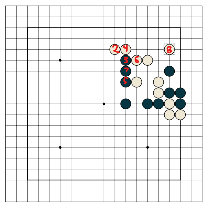 — If Black makes 8-in-a-row or more anywhere on the board (even on the first and second lines), this is called overlining and Black loses the game immediately - White must get at least 7 stones in a row in order to win