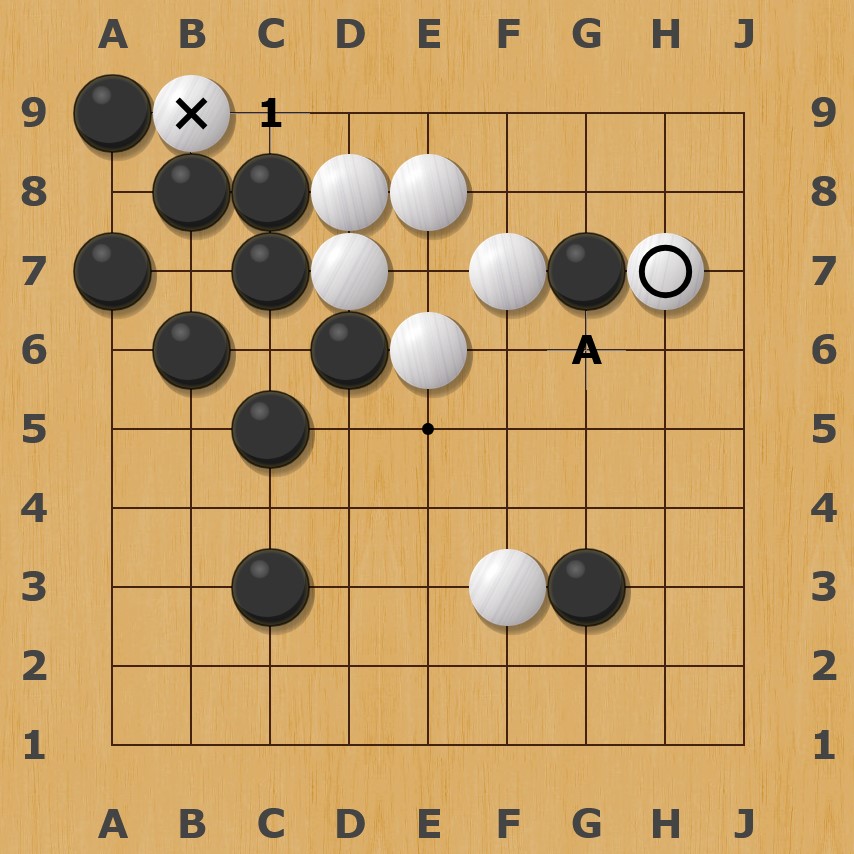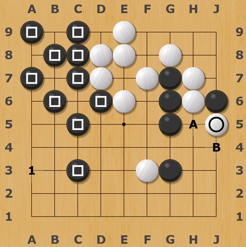 - White’s last move would have been better at A: then you would have to play B to save your two stones.