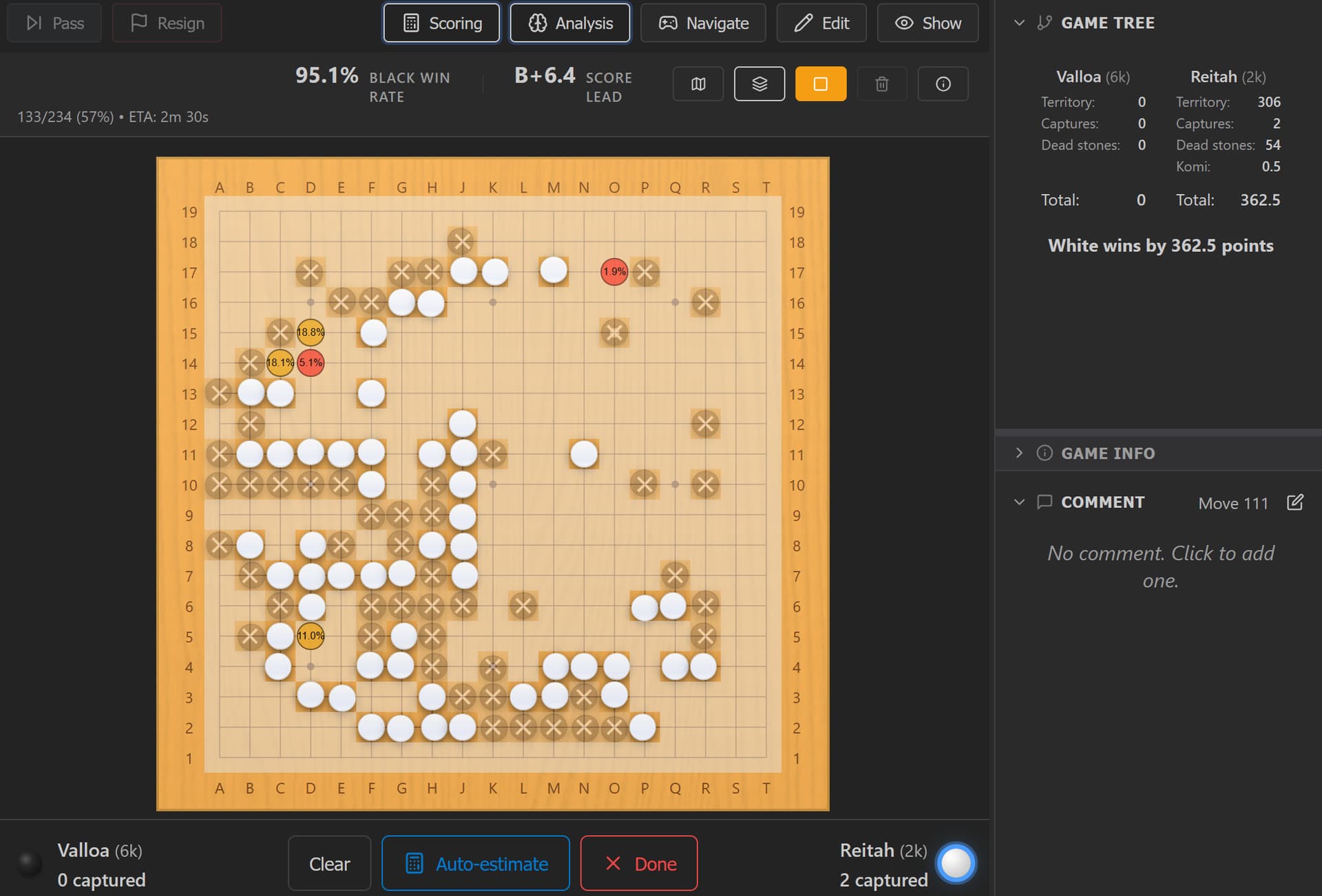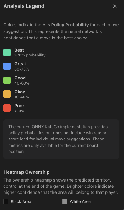 Kaya also proposes an AI Analysis feature leveraging converted Katago weights to be able to run Katago directly in the browser: GitHub - kaya-go/katago-onnx: Convert KataGo models to ONNX . It’s not as strong as Katago itself since I haven’t implemented MCTS, but it’s largely sufficient for an average player.