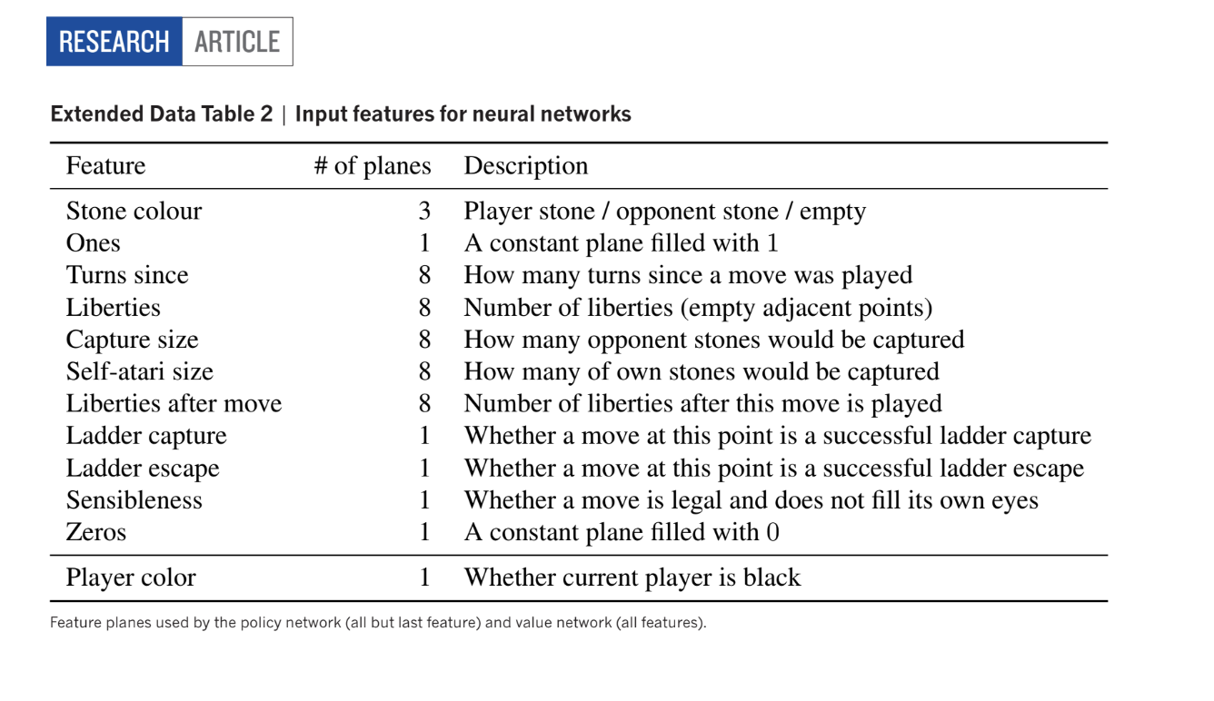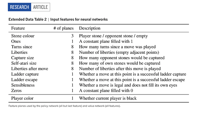 The Master version, had the concept of what moves where ladder breakers and ladder captures. Here is the original feature information, the information what goes into Masterās network to determine what are good moves, and who is ahead: