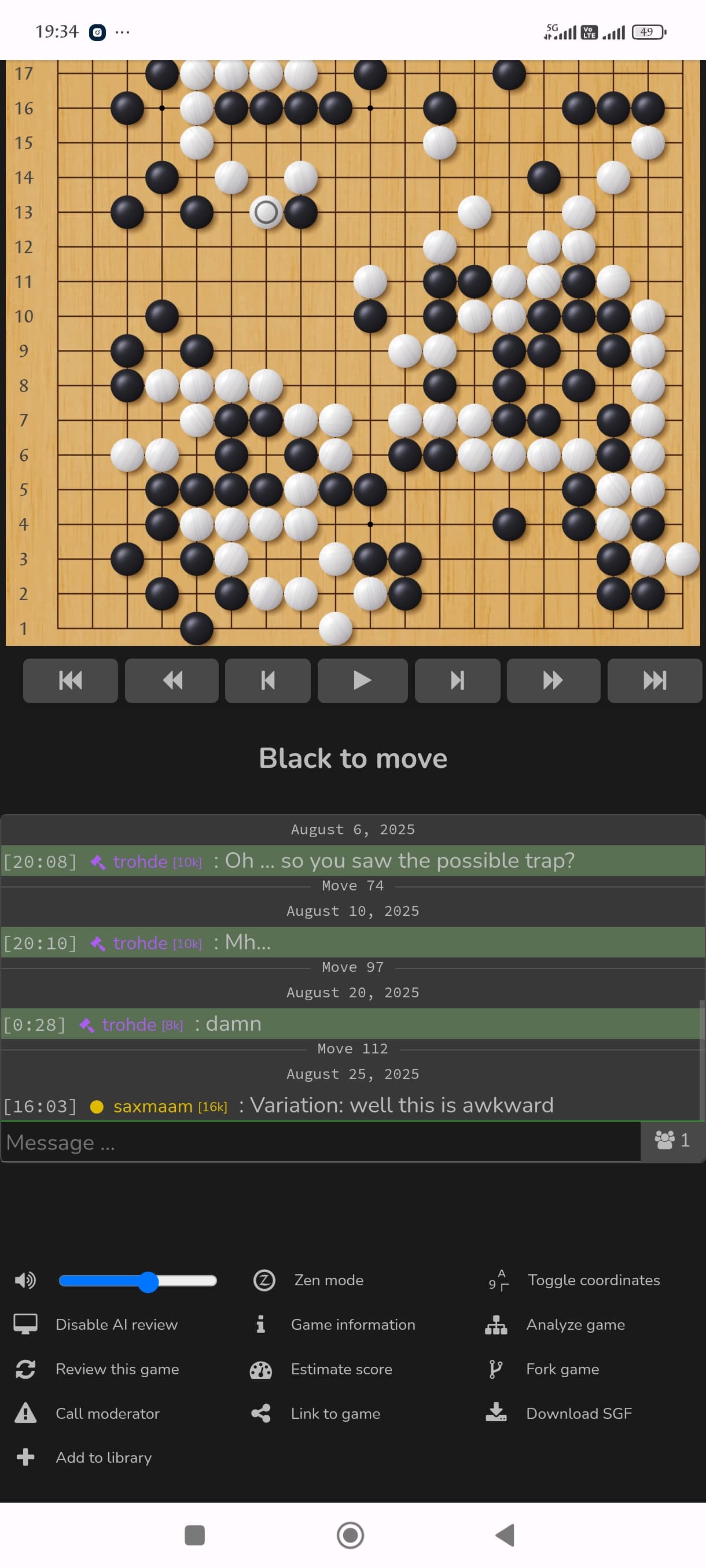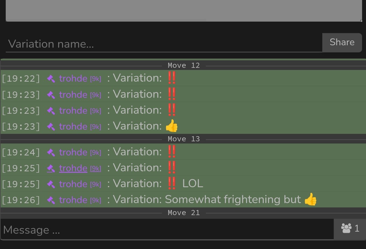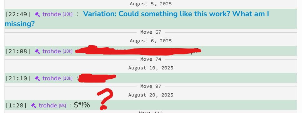 @trohde is it appropriate to blame you for obscene words in public chat? I suppose you as a moderator should not say anything that doesn’t seems polite enough. I think at 97 move you comment should be something like “It is very unusual but very pleasant” ![]()