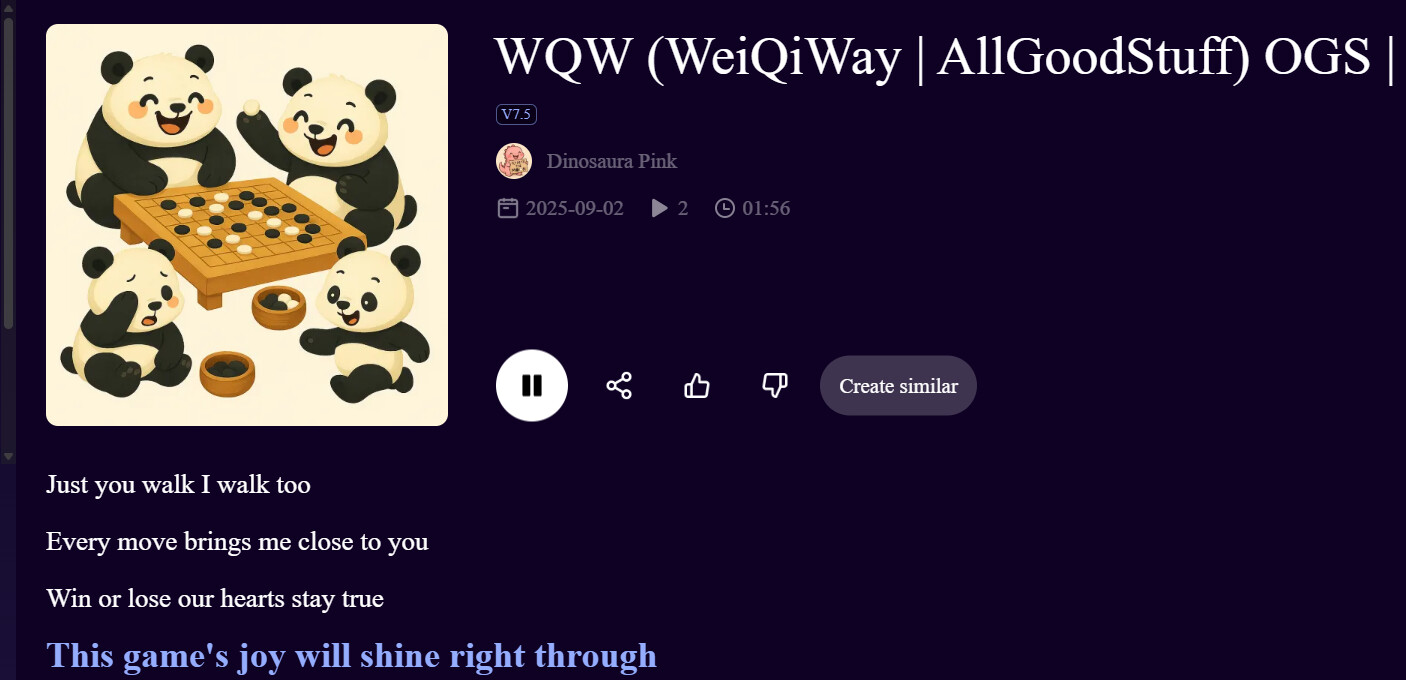 P.S. We’ve noticed that on the song’s cover, the Go stones aren’t placed quite right. They’re as chaotic as our team! We’ll get it fixed once we figure out how to teach SORA Ai (by OpenAi/ChatGPT) or calm down this Pan Pan tribe—whichever happens first.