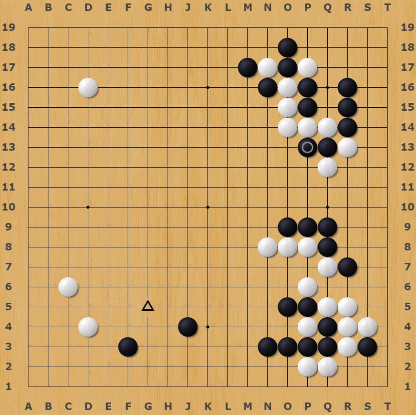 I’m black and I just ran out the laddered stone (after quadruple checking that the ladder is currently good for me). In the game my opponent went for a ladder breaker at the triangle, which looks promising, but it turns out I could ignore it and get a good result.