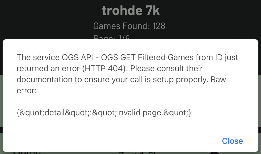 The service OGS API - OGS GET Filtered Games from ID just returned an error (HTTP 404). Please consult their documentation to ensure your call is setup properly. Raw error: