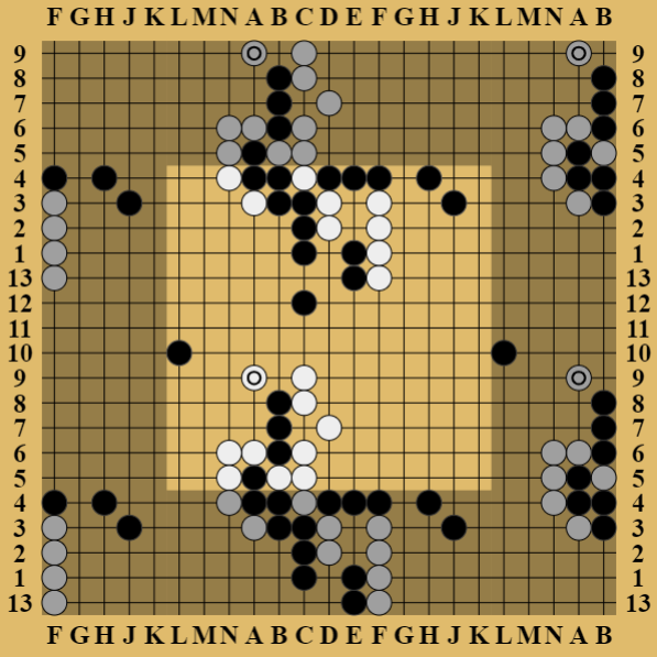 I got favorable position early on, white the situation is still simple. There’s only a few things to keep track of. And later on in the game the quality of my play dropped significantly, I think. In later stages of the game there’re a lot of stones and a lot of different things can interact with each other, that’s the part where the strength difference is showing the most. But looks like it was too late for le_4TC, and they were lowish on time. I gave away some advantage, but still won 7.5 points.