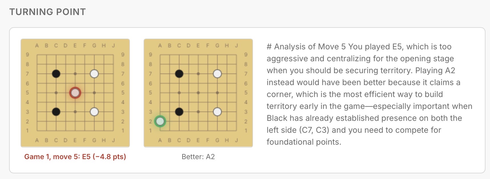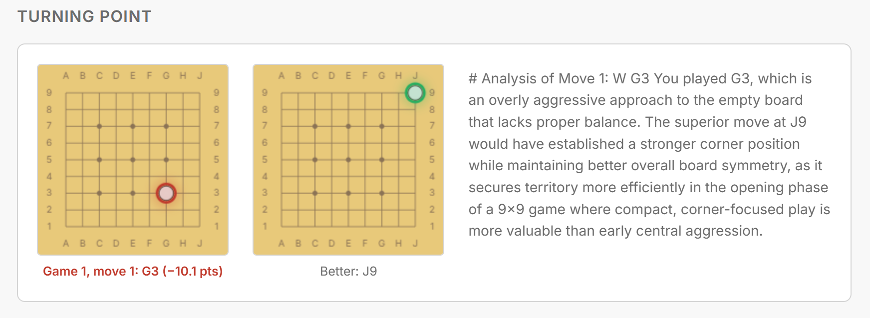 Thanks for trying it out–and the feedback! The data given is really just what KataGo comes up with. I agree with you @godeon it’s not as actionable as it could be in terms of the feedback it gives. I’ve been messing with it and trying to feed it the right games/moves etc to get more useful commentary out of it. I also agree that showing variations would be helpful, especially if useful commentary accompany the variations. I’m honestly not sure how much promise there is in a tool like this–I don’t know quite how to make it useful enough for someone to actually be helped by the feedback it gives (rather than just a passive, mildly interesting bit of commentary that it seems to currently provide). I’ll keep fiddling with it!