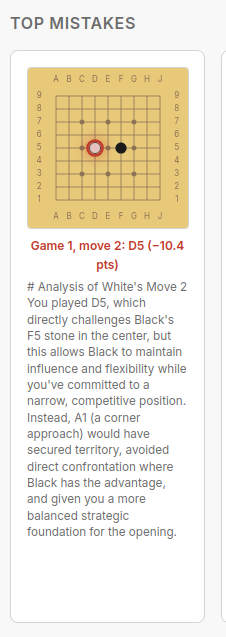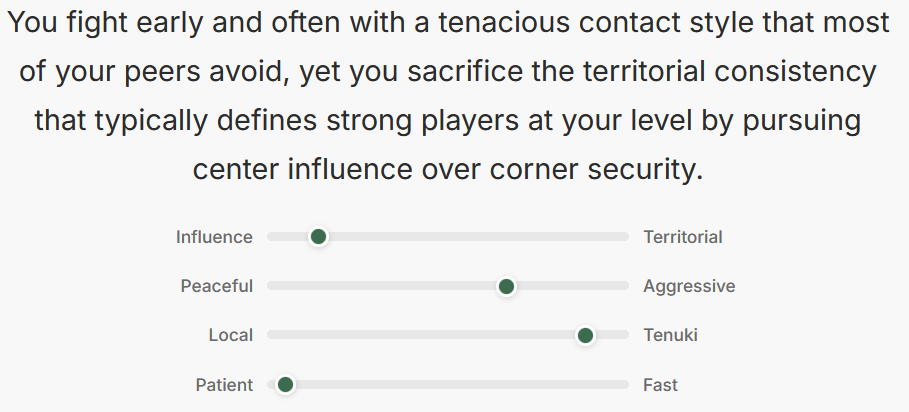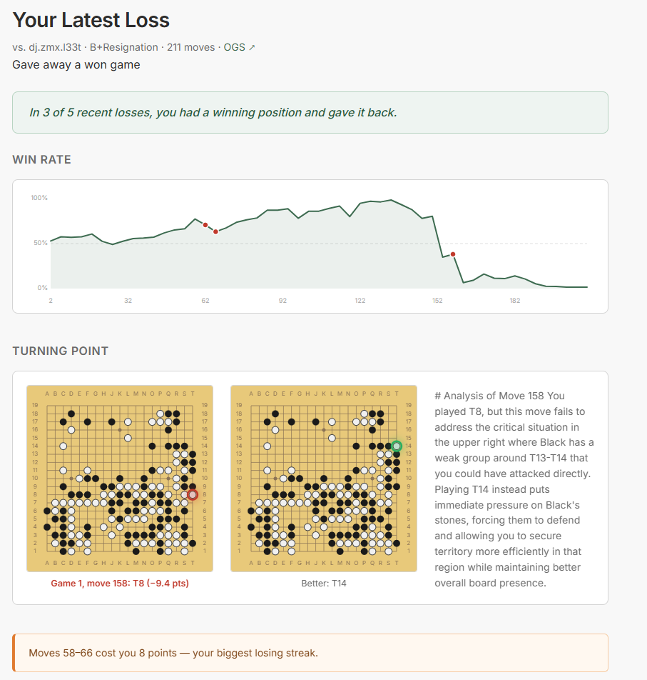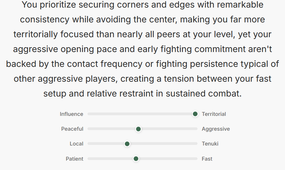 I’ve whipped up (read: vibe coded) a small tool that might be interesting: https://aji-style.fly.dev/ You can enter your OGS username in there and get some insights about your playing style and some ideas for improvement, all from LLMs and KataGo. It could certainly use some polish and refinement but if you’re interested in trying it out and have any feedback, please let me know. I found it pretty fun to browse around what it says about my play (the tl;dr of my recent games is that I’ve been losing won games because I’ve been distracted). Let me know what you think! (Also I hate the name of it so if you have a better idea, lmk)