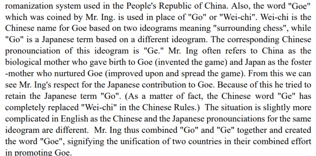 The competition WYGC is supported by the Ing Foundation. Games have to be played using the Ing rules. The term “Goe” was invented by Ing Chang-Ki. It refers to games played with that set of rules.