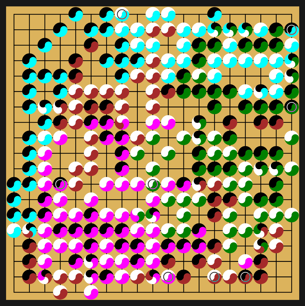 But of course a lot can still happen. For example one round is enough to capture the three White/Magenta stones that are separating Black in the left from the lower side group.