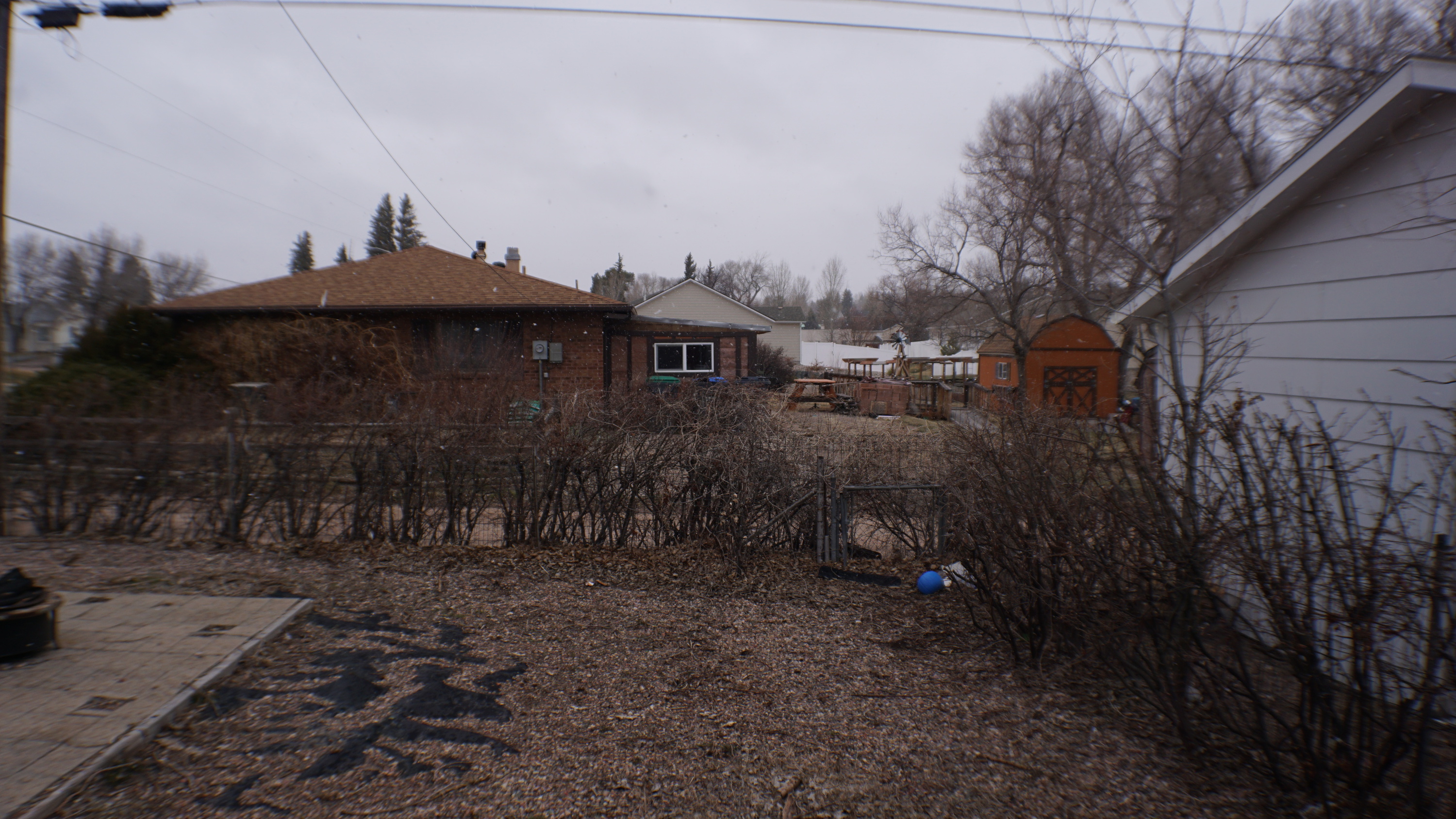 This morning, while our dog was using the potty. My (rental) back yard disappoints me, but the snow does not. The neighbor’s yard I’m across the street from, though… They’re always working hard at it.