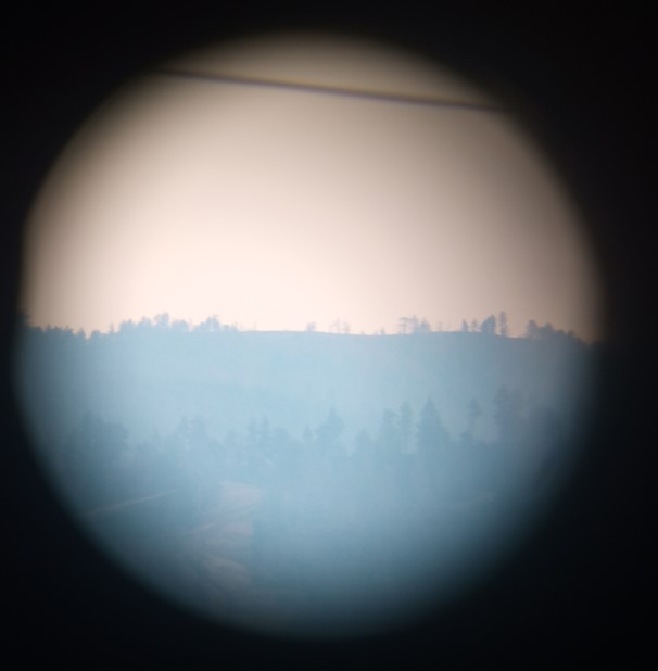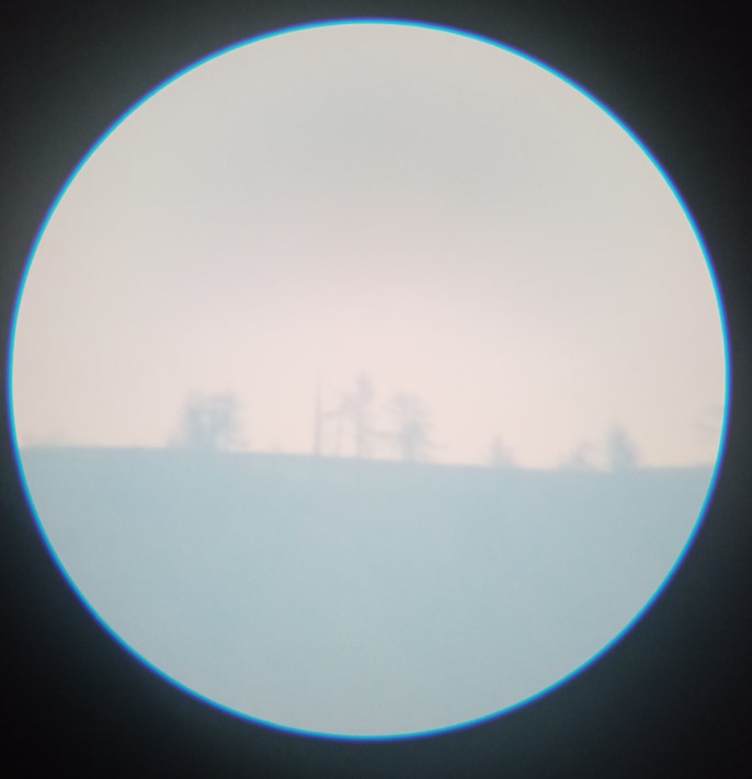 So here is the 32mm ( 28x magnification) - the images are from my shaky hand holding the phone on the eyepiece == reduced quality. Everything can be seen crisply with the eyes. This is just a magnification example (though there was some actual slight fog too, in the forest):